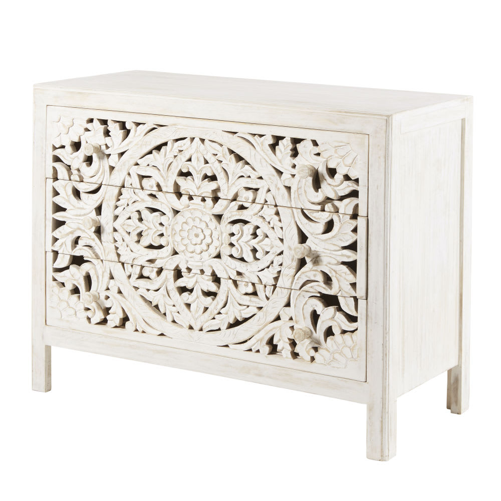 Kommode mit 3 Schubladen, aus massivem geschnitztem Mangoholz, weiß von Maisons du Monde