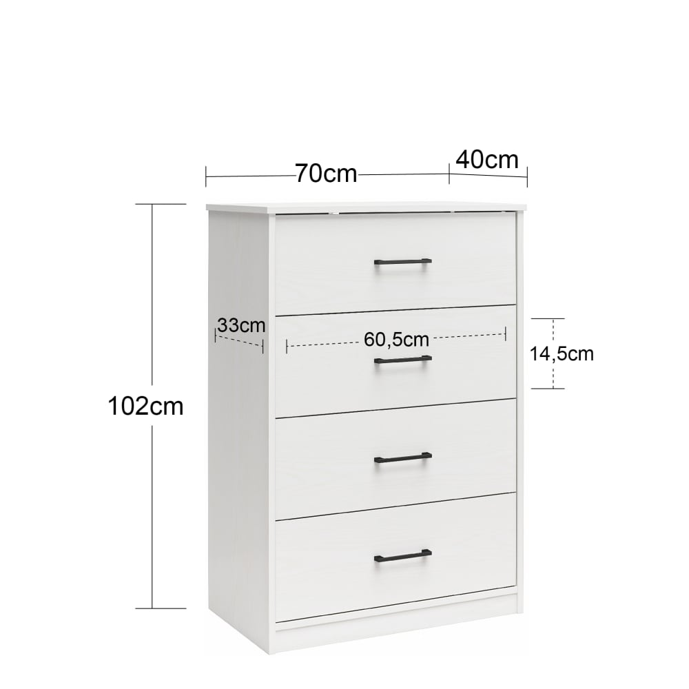 Diese Kommode mit vier Schubladen besteht aus laminiertem Spanplattenmaterial. Sie wird mit dem SwitchLock-System und vormontierte Schubladenschienen geliefert. Für die schnelle Montage wird nur wenig Hardware benötigt. Die geräumigen Schubladen sind perfekt zum Aufbewahren von gefalteter Kleidung. Die Kommode wird flach verpackt geliefert und erfordert den Zusammenbau durch zwei Erwachsene. Um ein Umkippen zu verhindern, ist ein Schubladenverriegelungssystem enthalten. Es kann immer nur eine Schublade gleichzeitig geöffnet werden. Ein Wandanker-Set ist für die sichere Befestigung enthalten.
