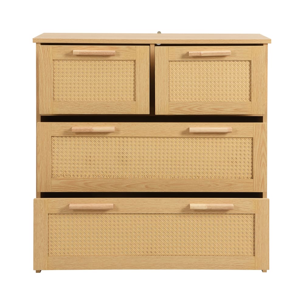 Modernes Naturrattan: Dieser Rattanschrank kombiniert ein modernes Design mit natürlichen Rattan-Design-Schubladen in einem schlichten Naturholzton. Hochwertiges Material: Unser Schubladenschdrank besteht aus hochwertigem Spanplattenmaterial, das eine solide Konstruktion gewährleistet, während die Rattanschubladen umweltfreundlich und glatt sind. Die geschmeidigen Gleitschienen ermöglichen ein müheloses Herausziehen und Schließen der Schubladen.Ausreichend Stauraum: Dieser Schubladenschdrank wurde funktional gestaltet, um Ihren verschiedenen Aufbewahrungsbedürfnissen gerecht zu werden. Mit 4 tiefen Schubladen bietet er Ihnen ausreichend Stauraum für den täglichen Gebrauch, damit Sie Ihre Gegenstände ordentlich aufbewahren können. Vielseitig einsetzbar: Egal ob in Ihrem Schlafzimmer, Wohnzimmer, Flur oder anderen Bereichen, in denen Sie Stauraum und Organisation benötigen, dieser Rattanschrank wird Ihnen dabei helfen, Ihr Zuhause aufgeräumt und stilvoll zu halten. Angemessene Tragfähigkeit: Wir haben die Tragfähigkeit dieses Kommode vernünftig und praktisch festgelegt, um Ihren Anforderungen im täglichen Leben gerecht zu werden. Die Tischplatte kann bis zu 50 Pfund tragen, sodass Sie Ihre Alltagsgegenstände bequem darauf abstellen können. Jede der vier Schubladen hat eine Tragfähigkeit von 20 Pfund und bietet ausreichend Platz für Ihre persönlichen Gegenstände.