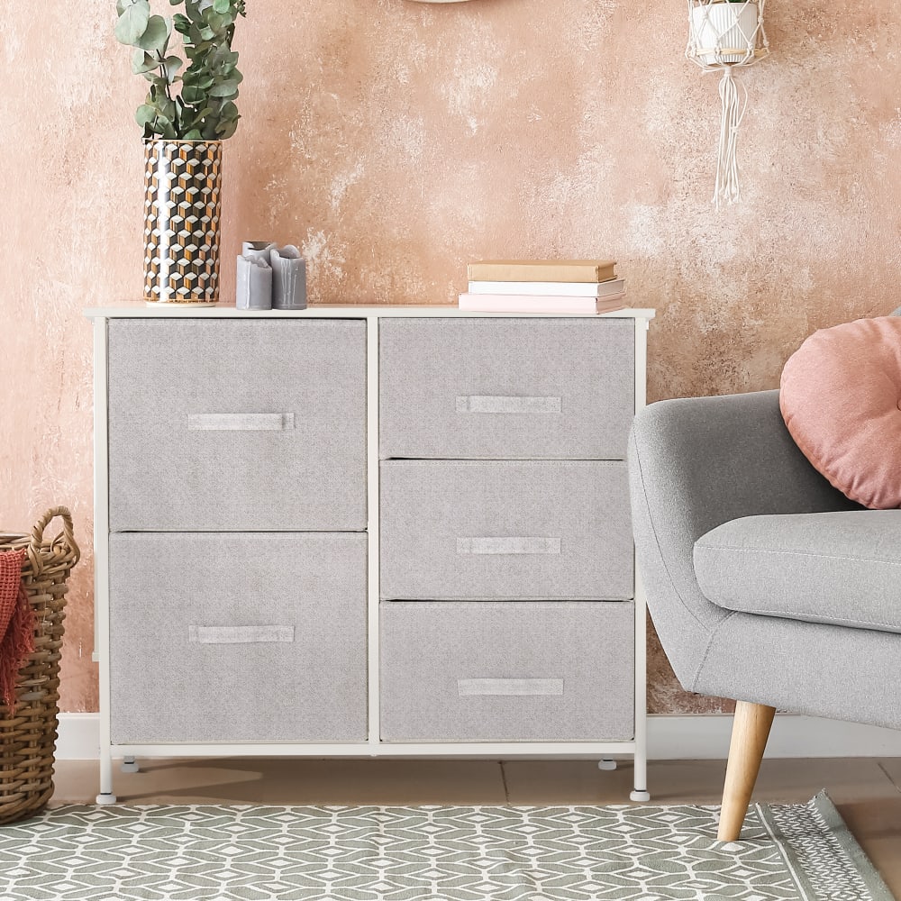 Der multifunktionale Textilschrank mit 5 Schubladen von ML-Design besitzt eine stabile Stahlkonstruktion mit einer MDF-Platte in Holzoptik und eignet sich perfekt für Ihr Wohnzimmer, Schlafzimmer, Kinderzimmer oder den Flur. Durch das platzsparende Design bietet der Schrank maximalen Stauraum ohne viel Platz einzunehmen.