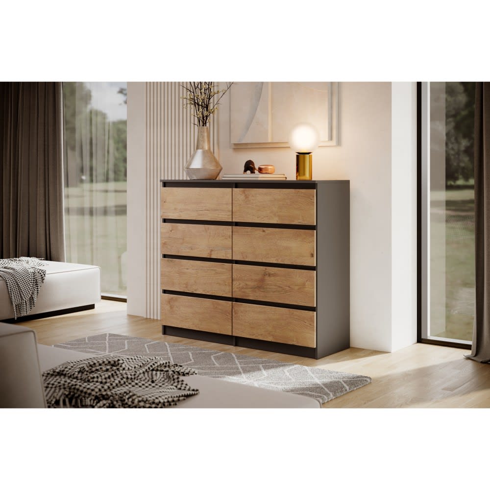 Dank ihres minimalistischen Designs und der vielseitigen Farbauswahl ist die Kommode LEMON mit acht Schubladen nicht nur ein praktisches Aufbewahrungsmöbel, sondern auch ein stilvolles Element in jedem Raum. Ihre robuste Bauweise und hochwertige Verarbeitung machen sie zu einem langlebigen Möbelstück, das Ihren Wohnraum funktional und optisch bereichert.