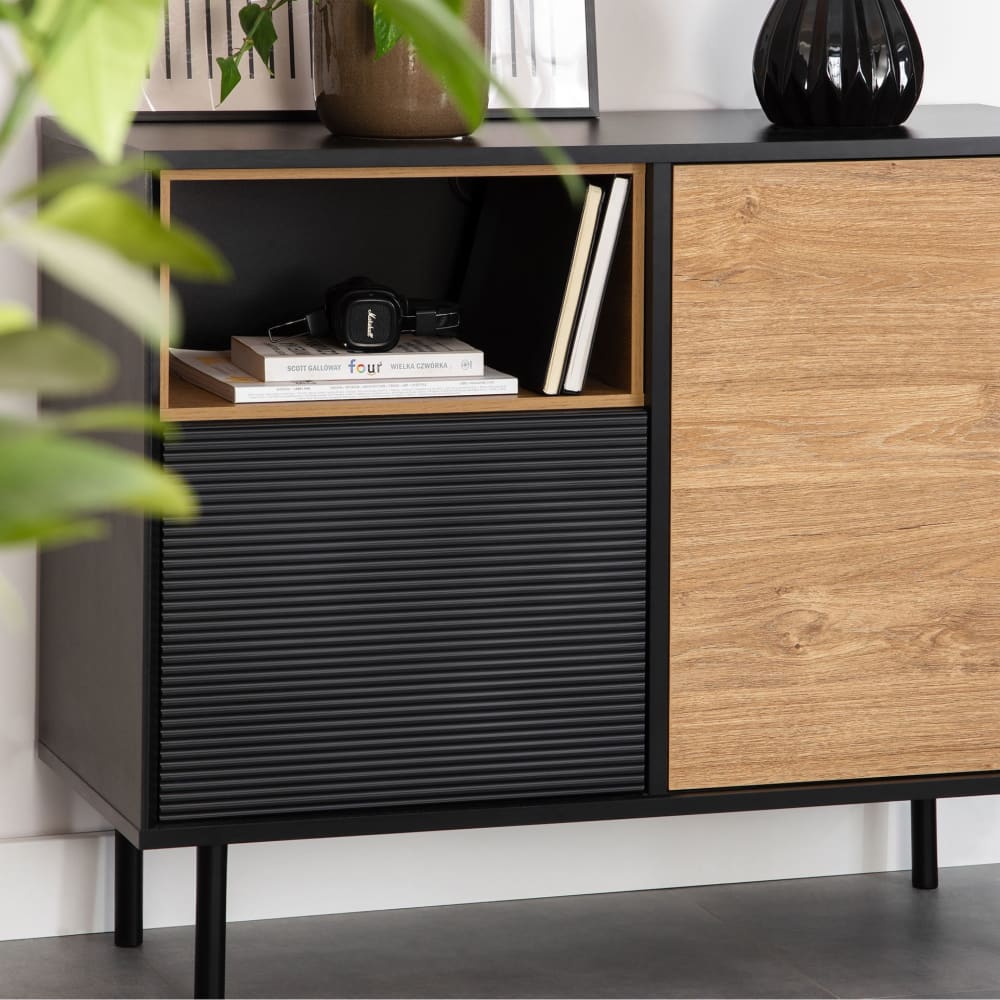 Die Möbel sind mit verschiedenen Arten von Regaleinsätzen ausgestattet, die sich in Form und Farbe unterscheiden. Auch die LOFTY-Kollektion enttäuscht nicht, was die Verarbeitung angeht. Ausgewählte hochwertige Materialien sorgen für Stabilität und eine einzigartige Optik. Ebenso wichtig ist die Kombination aus schwarzem Laminat und eichenfarbenem Dekor, die perfekt zusammenpassen. Die Kollektion ist nicht nur für den rohen Industriestil, sondern auch für den wärmeren Loft-Stil geeignet. Der Loft RTV-Schrank in Eiche natur/schwarz ist in erster Linie ein Möbelstück für Nutzer, die Wert auf Details und hochwertige Verarbeitung legen. Er bietet Platz für viele praktische Dinge wie Dokumente, Fernsehgeräte oder andere wichtige Dinge. Die gesamte Kollektion besteht aus drei Arten von Kommoden, zwei Arten von Bücherregalen, Vitrinen und RTV-Schränken.A) Das Push-to-Open-Schließsystem verfügt über spezielle Verriegelungen, so dass Sie einfach an der entsprechenden Stelle auf die Tür oder die Schubladen drücken, um sie zu öffnen. B) Die Türen sind mit in drei Ebenen verstellbaren Scharnieren versehen. C) Das Möbelstück hat Vertiefungen und ungleichmäßige Oberflächen, so dass das Material nicht eben ist. D) Die Möbel haben Elemente, die geriffelt sind, d.h. tiefere Rillen haben, die die Möbel verzieren. Ein zusätzliches Unterscheidungsmerkmal ist das Fräsen, d.h. die Möglichkeit, den Oberflächen eine beliebige Form zu geben. E) Die Möbel haben Einsätze, die in verschiedenen Formen und Farbvarianten erhältlich sind. F) Die Möbel stehen auf hohen Beinen aus massivem, lackiertem Holz, von denen eines verstellbar ist. G) Die Schubladen haben eine Soft-Close- und Push-to-open-Funktion. H) Optional kann eine LED-Beleuchtung erworben werden, die dann an den Regalen angebracht wird.sku:12607.23.883