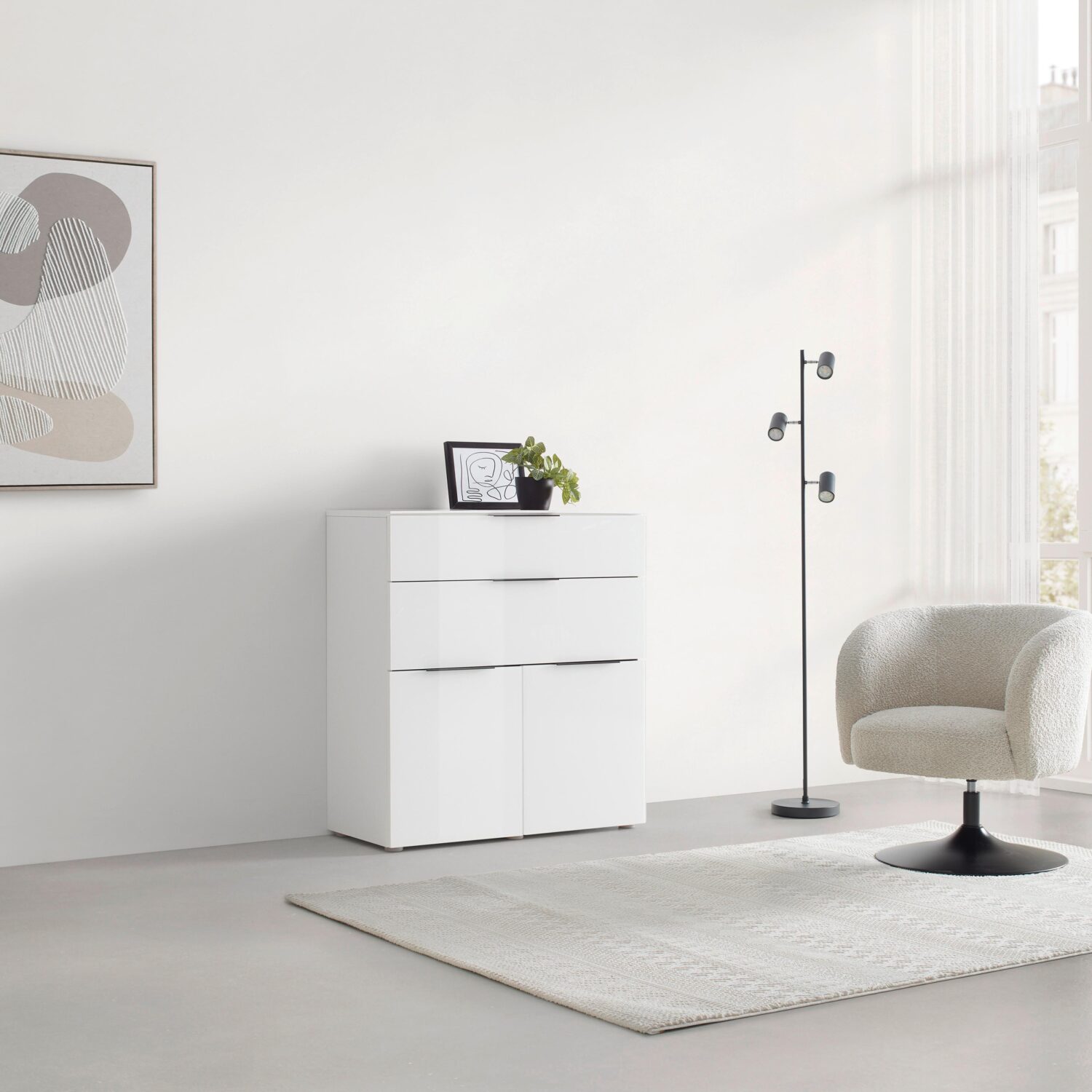 Die Kommode VELARIS ist nicht einfach nur ein Möbelstück – sie ist Ihr neuer Allrounder für stilvolle Ordnung in jedem Raum. In strahlendem Weiß mit einer edlen Glasfront bringt VELARIS Licht und Leichtigkeit in Ihre Einrichtung und passt sich jedem Stil an, ob minimalistisch, skandinavisch oder modern-elegant. Mit Maßen von ca. 90 x 98 x 40,5 cm (B x H x T) bietet VELARIS jede Menge Platz: Im Wohnzimmer für Technik und Deko, im Esszimmer für Geschirr und Servietten oder im Schlafzimmer für Ihre liebsten Textilien und Accessoires. Zwei Drehtüren und zwei Schubladen mit Soft-Close-System sorgen für leises Schließen, während schwarze Metall-Kantengriffe elegante Akzente setzen und das moderne Gesamtbild perfekt abrunden. Ob Wohnzimmer, Esszimmer, Flur oder Schlafzimmer – VELARIS bringt stilvolle Ordnung in Ihr Zuhause und schafft ein edles Ambiente, das begeistert.