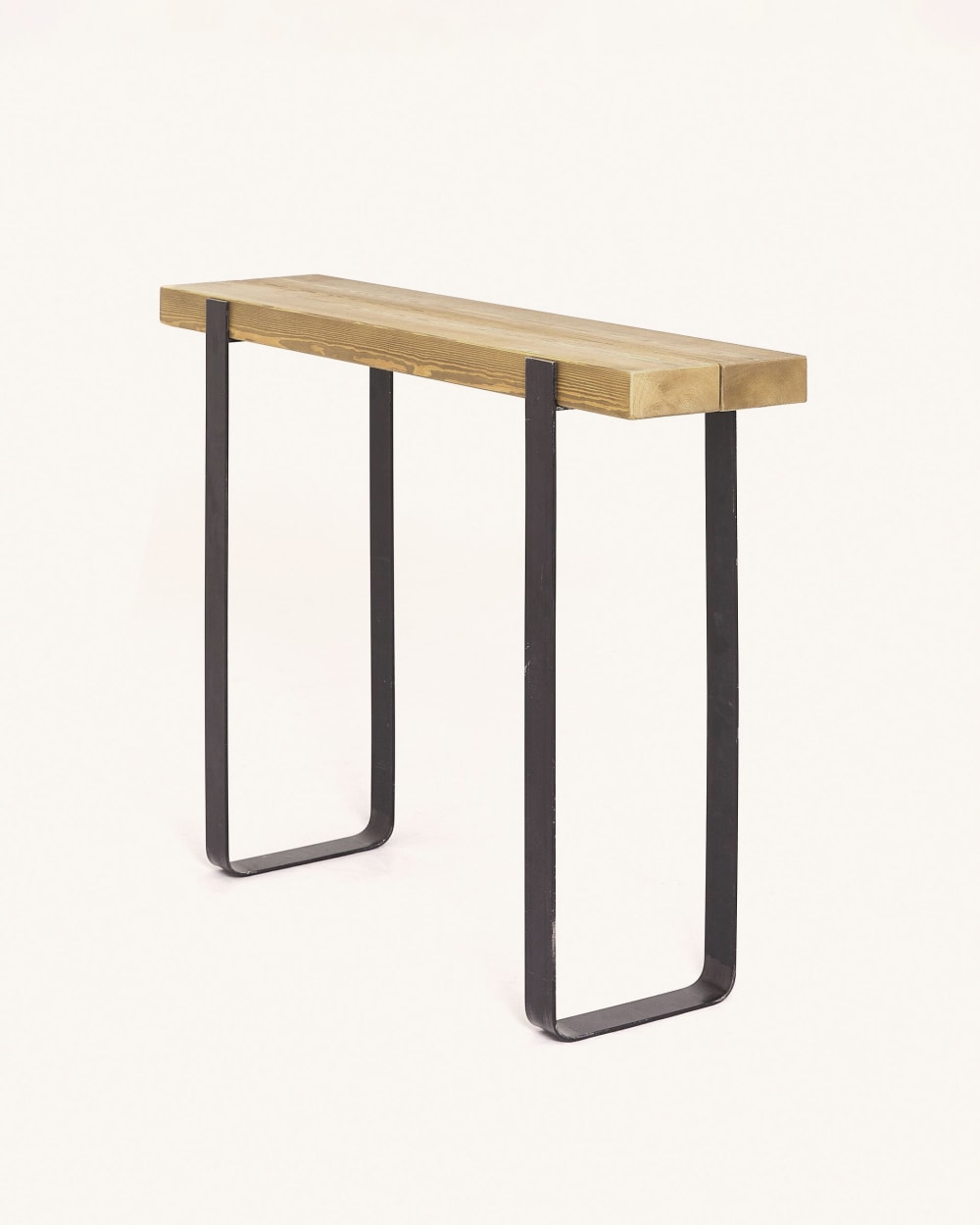Die Faraji-Garderobe besteht aus einem Holzplatte aus nachhaltig beschaffenem flämischen Kiefernholz und zwei imposanten schwarzen schmiedeeisernen Beinen. Die Stärke des Holzes, 5,5 cm, verleiht dem Ganzen ein sehr robustes Aussehen. Es handelt sich um ein industrielles Design, das Ihrem Eingang den gebührenden Stellenwert einräumt. Sie können aus mehreren Oberflächen für das Holzstück wählen: Nussbaum, gealterter Nussbaum, Olive, Desert, gealtertes Weiß und Natur.