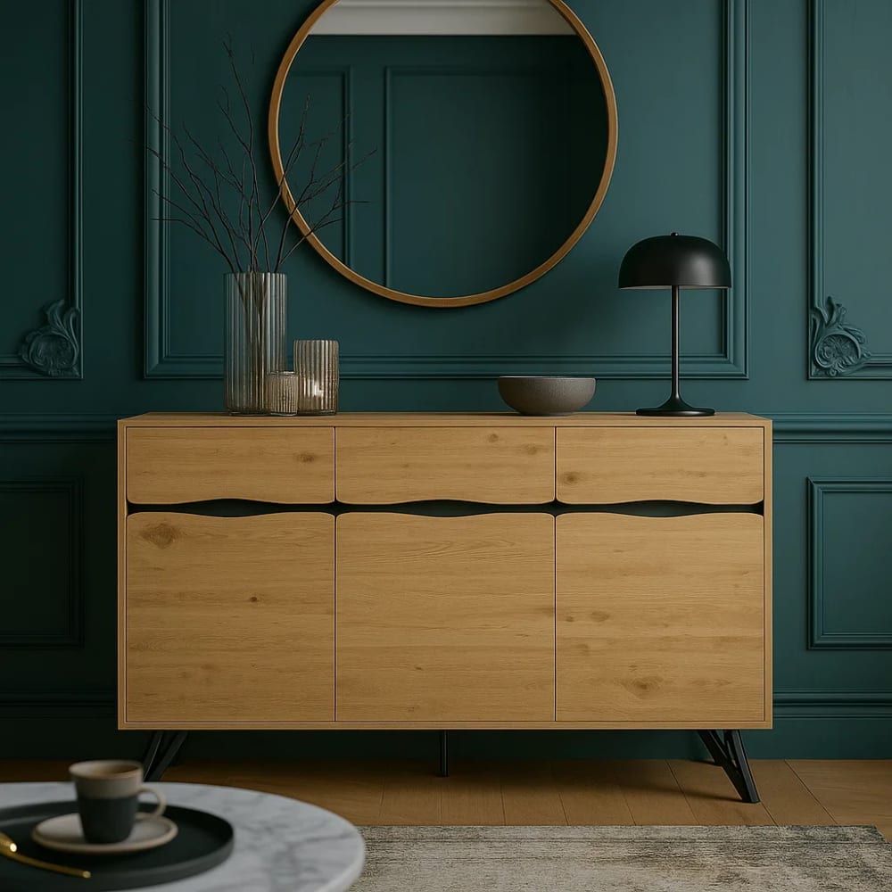 Drei Flügeltüren verbergen einen geräumigen Stauraum mit Ablageflächen ideal für Geschirr, Bücher, Wäsche oder andere persönliche Gegenstände. Diese Anordnung sorgt für Ordnung und gleichzeitig für einen klaren Stil.