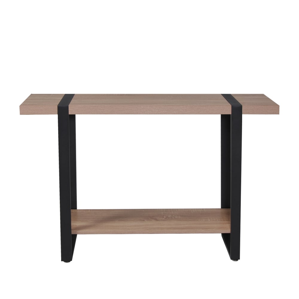 Konsole SINTRA: Gestell aus schwarzem Metall. 2 Platten aus melaminharzbeschichteter Spanplatte, Stärke 45mm. Ausführung: Gebleichtes Eichendekor, Füße aus schwarzem Metall. Höhe: 82cm. Tiefe: 30 cm. Länge: 120 cm. Selbstmontage