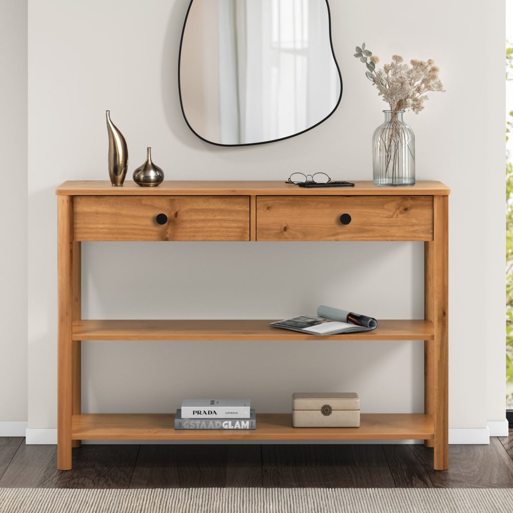 Die Konsole APOANA überzeugt mit natürlichem Design. Gefertigt aus massivem Kiefernholz und eichefarben lackiert, bringt sie Wärme und Stil in Ihr Zuhause. Zwei Schubladen und zwei offene Ablagen bieten praktischen Stauraum für Deko oder Alltagsgegenstände. Dank der schmalen Form eignet sich der Tisch perfekt als Flurmöbel, Ablagetisch oder schmale Kommode für Flur, Wohnzimmer oder Schlafzimmer.