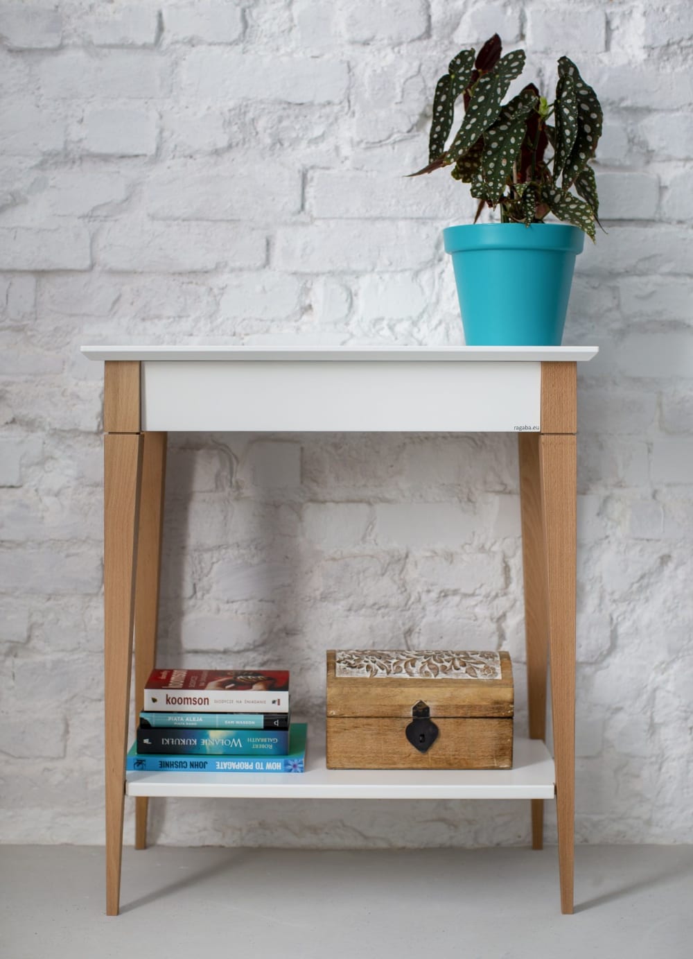 Der schmale Mimo Konsolentisch bietet nicht nur einen stilvollen Akzent für Ihr Interieur, sondern auch zusätzlichen Platz zum Präsentieren von Pflanzen, gerahmten Bildern oder einfach zum Abstellen von Geldbörse, Brieftasche oder Schlüsseln. Ein Konsolentisch mit Fach eignet sich perfekt für Flure oder Eingangsbereiche.