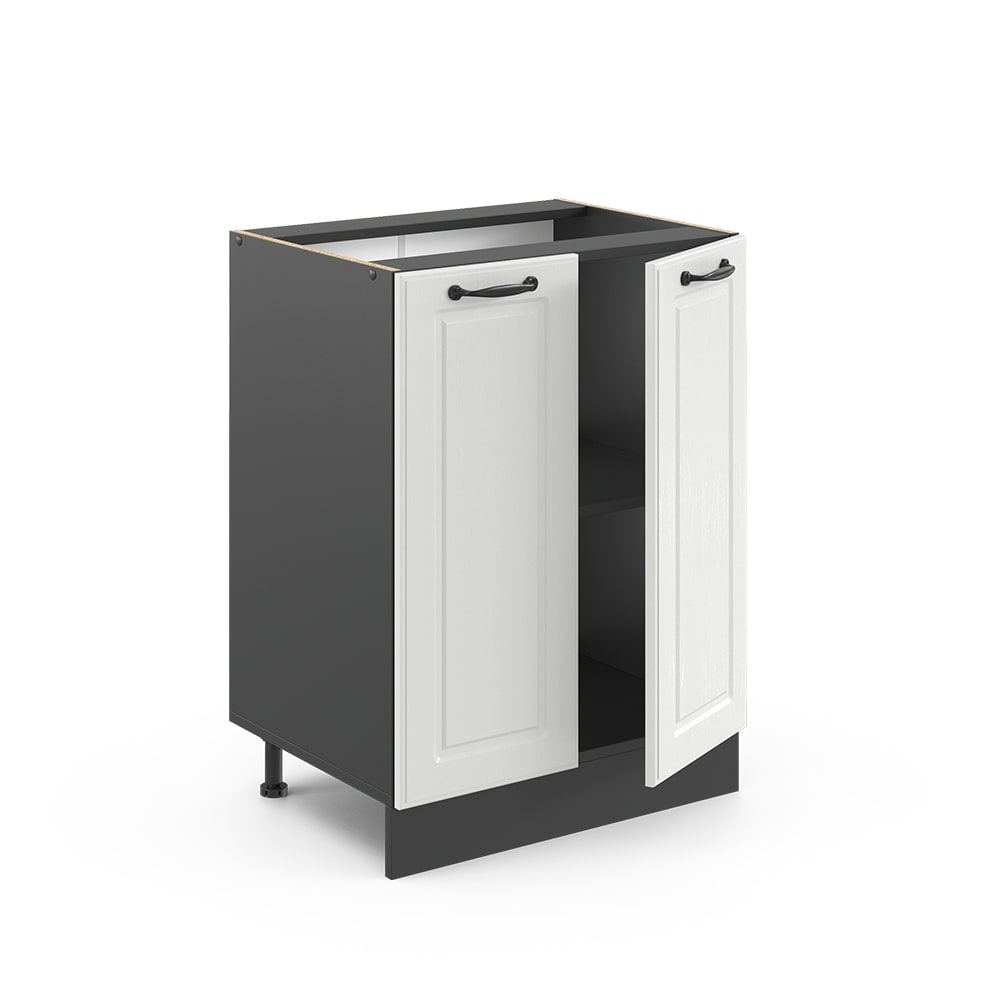 Mit dem R-Line Küchenunterschrank (ohne Arbeitsplatte) erhalten Sie eine hochwertige Komplettlösung für Ihre Küche. Das stehende Möbelstück ist in verschiedenen Konfigurationen erhältlich und kann nach Belieben umgestellt werden. Zusätzliche Module können ganz einfach bezogen werden, um Ihre Küche perfekt zu ergänzen. Höhenverstellbare Füße sorgen für eine optimale Anpassung an Ihre Arbeitsplatte und sorgen für zusätzliche Flexibilität. Der R-Line Küchenunterschrank ist die perfekte Wahl für alle, die zeitlos elegante Möbel in bester Qualität suchen. Machen Sie Ihre Küche zu einem echten Highlight und setzen Sie auf eine Lösung, die Ihnen lange Freude bereiten wird.—Technische Details:Farbe Korpus:AnthrazitFarbe Front:Weiß LandhausMaße:60 x 81.6 x 46 cm (BxHxT)Innenmaße:567 x 684 x 440 mm (BxHxT)Material:Spanplatte, 16 mmOberfläche:MelaminharzbeschichtungArtikelgewicht:19.42 kgArtikelgewicht inkl. Verpackung:21.4 kg—LIEFERUMFANG: Küchenunterschrank als Bausatz (Hinweis: Dekoration nicht im Lieferumfang enthalten), Montageanleitung, Montagematerial.