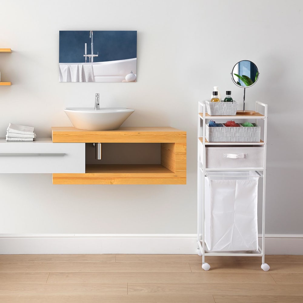 Optimieren Sie Ihre Küche mit dem vielseitigen Küchenwagen im Versa-Stil. Dieser praktische Wagen ist 105,5 cm hoch, 32,5 cm lang und 39 cm breit und besteht aus Bambus, Metall und Textil und vereint Haltbarkeit und Ästhetik. Die weiße Farbe fügt sich problemlos in jede Einrichtung ein und sorgt für zusätzlichen Stauraum und Mobilität in Ihrer Küche. Ideal für alle, die Funktionalität suchen, ohne auf Stil zu verzichten. ?
