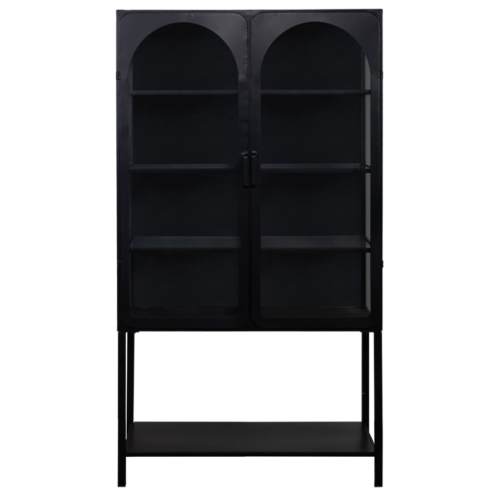 Eine Vitrine aus schwarzem Metall mit den Abmessungen 88x44x160 cm ist ein auffälliges und funktionales Möbelstück, das Stil und Funktionalität in Ihr Zuhause bringt. Mit ihrem modernen Design und dem schwarzen Finish kombiniert diese Vitrine die Haltbarkeit des Metalls mit der Eleganz der Farbe. Mit einer Länge von 88 cm, einer Tiefe von 44 cm und einer Höhe von 160 cm bietet diese Vitrine reichlich Platz zur Präsentation und Aufbewahrung Ihrer wertvollsten Gegenstände wie Geschirr, Bücher, Erinnerungsstücke oder andere dekorative Artikel. Die Regale und Glastüren sorgen für eine klare Sicht und Schutz vor Staub, während das vielseitige Design es ermöglicht, sie im Wohnzimmer, Esszimmer oder sogar im Flur aufzustellen. Das schwarze Metall fügt dem Raum einen Hauch von Raffinesse und Modernität hinzu, wodurch eine elegante und zeitgenössische Atmosphäre entsteht. Diese schwarze Metallvitrine ist eine vielseitige Option, die sich verschiedenen Dekorstilen anpasst, von industriell und minimalistisch bis hin zu eklektisch oder klassisch, und bringt sowohl Funktionalität als auch Stil in Ihr Zuhause. Montage erforderlich.