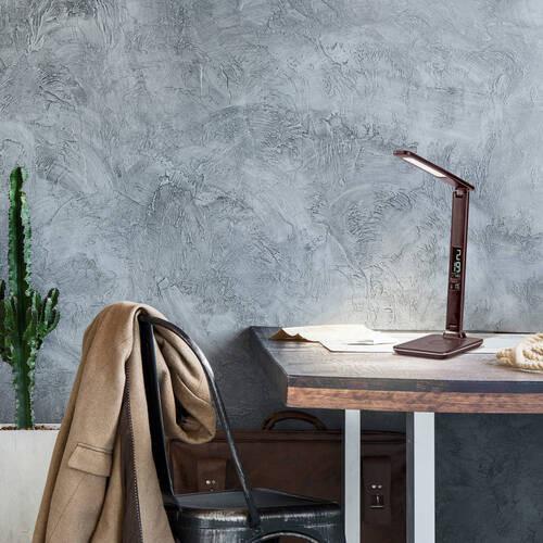 Egal ob auf dem Schreibtisch oder dem Nachtkästchen – die LED-Tischleuchte ADRIANO bringt Licht in dunkle Wohnräume. Die etwa 31 x 14 x 60 cm (L x B x H) große Tischleuchte aus Kunststoff und Eisen begeistert in edlem Braun und ist mit einem 5W LED ausgestattet. Dieses punktet mit einem Farbtemperaturwechsler, der Ihr Interieur in angenehm kalt-, tageslicht- oder warmweißes Licht taucht. Neben einer integrierten Timer-Funktion ist bereits ein Ladegerät im Lieferumfang enthalten und die klappbare sowie höhenverstellbare Leuchte unterstützt kabelloses Laden.