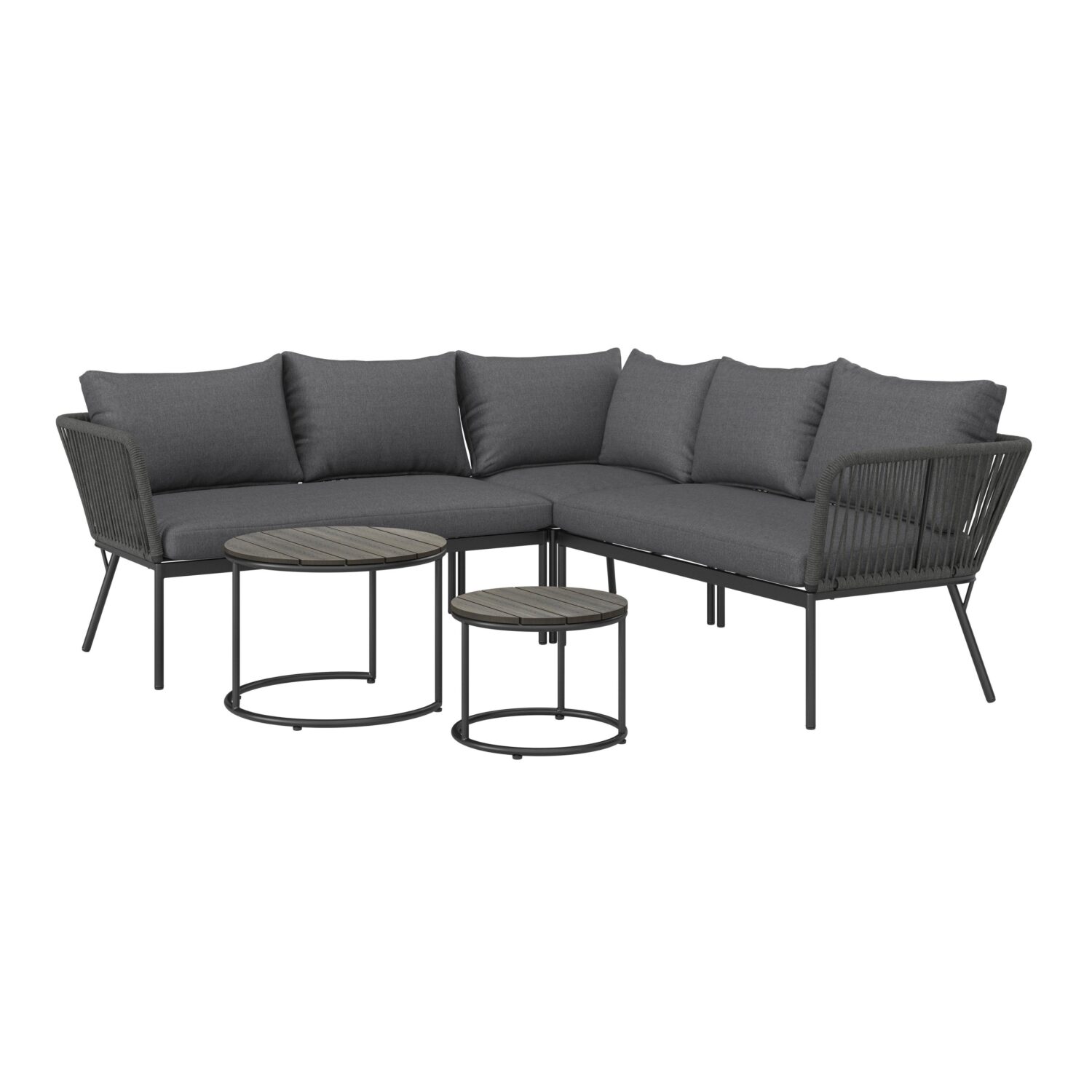 Verleihen Sie Ihrem Außenbereich mit der modernen Loungegarnitur Cemi in Anthrazit einen eleganten und komfortablen Rückzugsort. Das 5-teilige Set mit großzügigen Maßen von ca. 210 x 72 x 210 cm (B x H x T) bietet ausreichend Platz für gesellige Runden und entspannte Stunden im Freien. Die Loungegarnitur besteht aus zwei Sitzbänken, die dank der mitgelieferten vier Verbinder und einer Eckbank kombiniert werden können und somit eine komfortable Sitzfläche bieten. Für zusätzlichen Komfort sorgen die drei Sitzkissen mit Schaumstofffüllung und die sechs Rückenkissen mit Polyesterfüllung, die mit einem imprägnierten, abnehmbaren und waschbaren Webstoffbezug aus Textilgeflecht ausgestattet sind. Die beiden runden Tische, mit einem Durchmesser von ca. 60 cm und einer Höhe von ca. 44 cm sowie ca. 45 cm Durchmesser und einer Höhe von ca. 34 cm, runden das elegante Design ab und bieten flexible Ablageflächen für Getränke, Snacks oder Dekorationen. Mit einer Sitzhöhe inklusive Auflage von ca. 44 cm und einer maximalen Belastbarkeit von ca. 120 kg bietet diese Loungegarnitur sowohl Komfort als auch Stabilität. Verwandeln Sie Ihren Balkon, Ihre Terrasse oder Ihren Garten in eine stilvolle Wohlfühloase mit der Loungegarnitur Cemi und genießen Sie entspannte Momente im Freien!