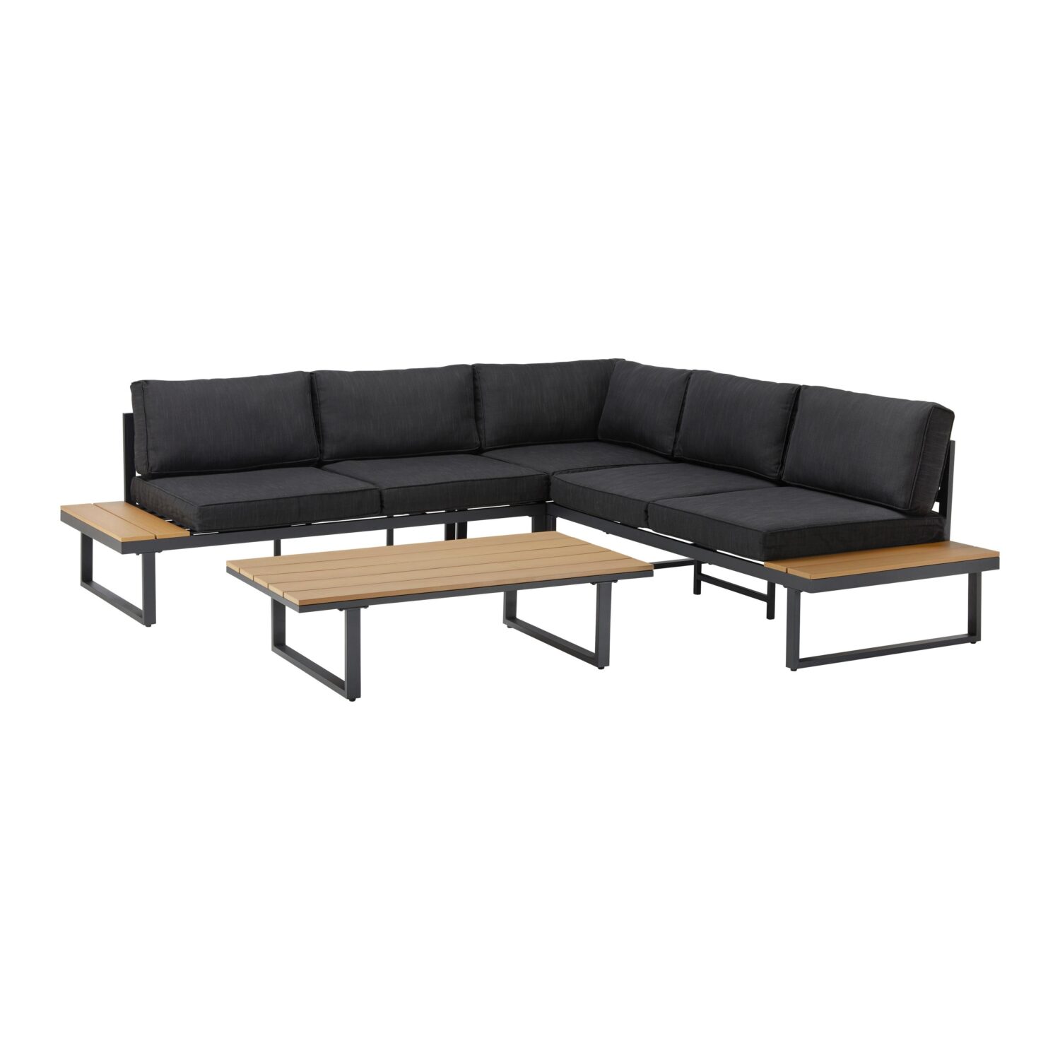 Die Loungegarnitur ARIANNA überzeugt mit einer stilvollen Kombination in Schwarz und Braun und verleiht Ihrem Outdoorbereich ein elegantes Flair. Das Set besteht aus 2 Sitzbänken, und 1 Tisch und macht das Urlaubsfeeling komplett. Auf dem Gestell aus schwarzem Stahl und Polywood® sorgen insgesamt 11 Rücken- und Sitzkissen für gemütlichen Komfort bis in die Morgenstunden. Unter dem hochwertigem Outdoorstoff in schwarz glänzt die Loungegarnitur mit einer weichen Füllung aus Polyester und Schaumstoff die zum Entspannen und Relaxen einlädt. Neben den praktischen Abstellflächen für Deko und Gläser an beiden Seiten, begeistert das geradlinige Set mit einem attraktiven Tisch auf dem ausreichend Platz für Snacks und kühle Getränke bleibt. (Die jeweiligen Maße finden Sie in der Produktbeschreibung) HINWEIS Dieser Artikel wird in unseren Filialen nicht ausgestellt, ist dort jedoch einfach und bequem bestellbar und wird direkt zu Ihnen nach Hause geliefert. Bitte beachten Sie, dass die abgebildete Dekoration im Lieferumfang nicht enthalten ist Stärke der Auflagen 10 cm.Diese Loungegarnitur ist UV-beständig und wetterfest.