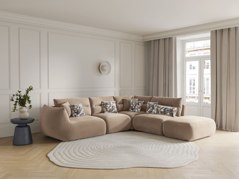 7-Sitzer Ecksofa rechts aus Samt mandelbeige 290x90x297cm Samt Beige CXL by Christian Lacroix Sofas und Sessel Sofas Ecksofas
