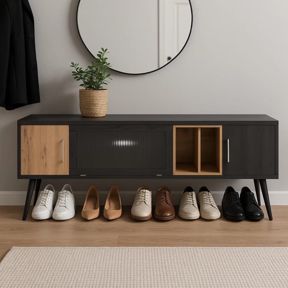 Die großzügige und übersichtliche Oberfläche des Schminktisches verfügt über zwei große Schubladen in der Mitte, ideal zur Aufbewahrung von Make-up, Schmuck, Haaraccessoires oder kleinen persönlichen Gegenständen. Links bietet ein mehrstufiges Aufbewahrungsmodul eine zusätzliche Schublade, ein offenes Fach für Alltagsgegenstände und zwei große Schubladen unten für sperrige oder wertvolle Dinge. Die runden, goldenen Griffe verleihen dem Schminktisch einen Hauch von Eleganz und harmonieren perfekt mit den goldenen Spitzen der schräg gestellten Füße, die für Stabilität und einen stilvollen Auftritt sorgen.