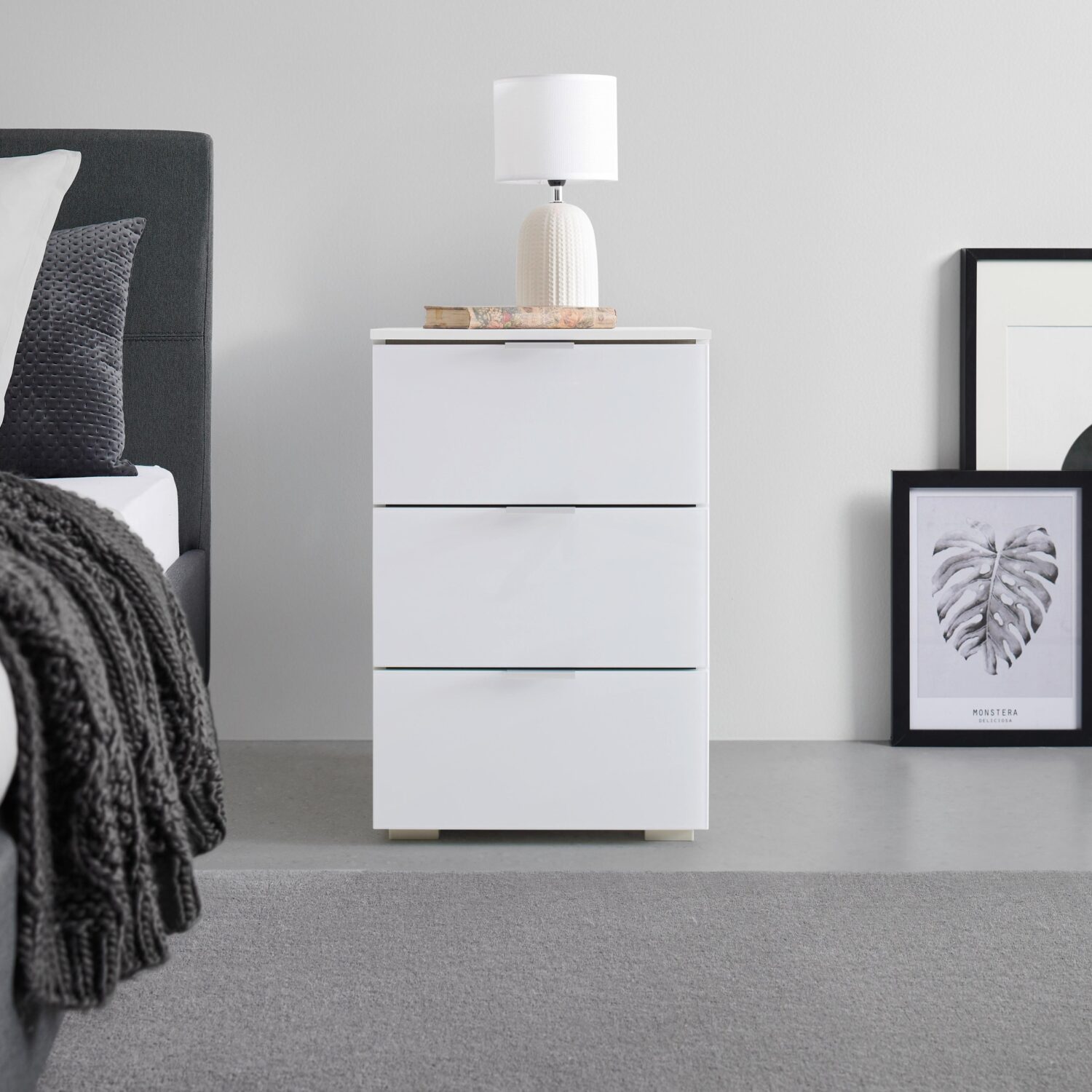 Das Nachtkästchen FIFTY in Weiß ist eine elegante und praktische Ergänzung für Ihr Schlafzimmer. Mit seinen klaren Linien und der modernen weißen Oberfläche fügt es sich nahtlos in jede Einrichtung ein und sorgt für eine helle, freundliche Atmosphäre. Dank der drei Schubladen bietet das Nachtkästchen zusätzlichen Stauraum für Bücher, Zeitschriften und andere persönliche Gegenstände. Die Kanten-Griffe in Chromfarben setzen einen stilvollen Akzent und verleihen dem Möbelstück eine moderne Note. Die eckigen Füße in Grau sind ca. 2 cm hoch und runden das Design harmonisch ab. Das Nachtkästchen FIFTY verfügt über eine bedruckte Nachbildung Oberfläche, die für eine hohe Widerstandsfähigkeit und einfache Pflege sorgt. Mit den Maßen von ca. 40 x 61 x 42 cm (B x H x T) passt es perfekt neben Ihr Bett und bietet ausreichend Stauraum. Der Korpus und die Front bestehen aus Holzwerkstoff