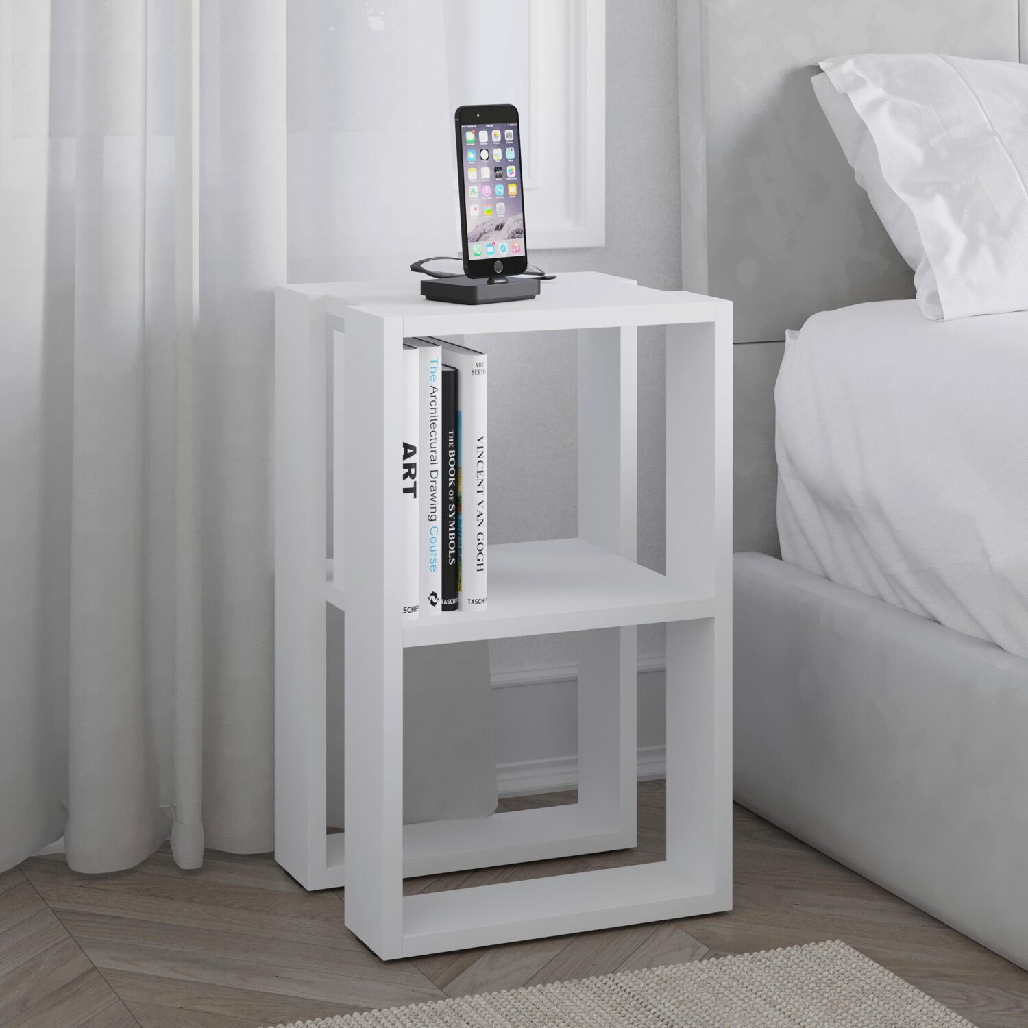 Der Nachttisch Lonie in Weiß ist die perfekte Wahl für eine stilvolle und praktische Ablage neben Ihrem Bett. Mit kompakten Maßen von ca. 35 x 55 x 30 cm (B x H x T) bietet er ausreichend Platz für Ihre wichtigsten Utensilien. Die Tischplatte hat eine Materialstärke von 18 mm und sorgt für Stabilität und Langlebigkeit. Gefertigt aus Holzwerkstoff mit einer Nachbildung der Holzqualität und einer pflegeleichten Melamin-Oberfläche, überzeugt der Nachttisch durch seine Strapazierfähigkeit und zeitlose Eleganz. Das besondere Design passt sich mühelos an verschiedene Betten und Einrichtungsstile an, wodurch er sich harmonisch in Ihr Schlafzimmer integriert. Mit dem Nachttisch Lonie schaffen Sie eine luftige und moderne Ablage, die nicht nur funktional ist, sondern auch zu einem stilvollen Akzent in Ihrem Raum wird. Ideal für diejenigen, die Wert auf Ordnung und Design legen.