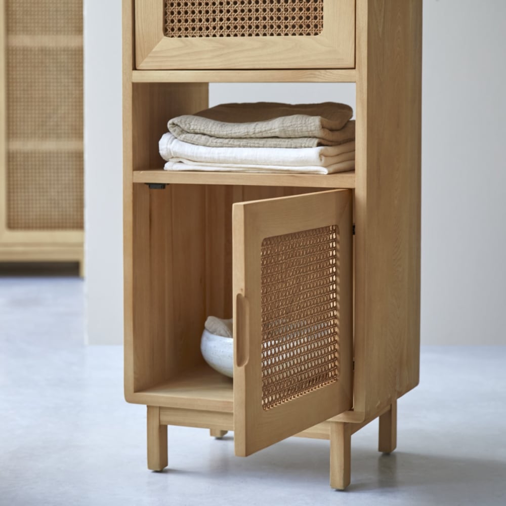 Er ist Stauraum und Deko-Element in einem und bietet Platz für Kosmetikprodukte und Handtücher*.