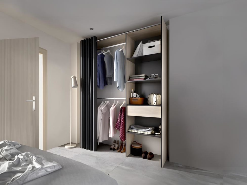 Das Kleiderschranksystem LAURENT besteht aus einer doppelten Garderobe und einem Wäscheschrank mit 4 Einlegeböden und einer Schublade. Mit diesen zahlreichen Stauräumen lassen sich alle Ihre Sachen unterbringen und effizient ordnen. Der Vorhang bringt einen Hauch von Moderne in Ihren Raum. Praktisch und modern, das Kleiderschranksystem LAURENT wird Ihr täglicher Verbündeter sein. Erweiterbares Kleiderschranksystem Dieses Kleiderschranksystem lässt sich dank seiner schneidbaren Garderobenstange von 110 auf 160 cm erweitern. Um die Länge anzupassen, schneiden Sie einfach die Garderobenstange auf die gewünschte Länge ab. Produktdetails Farbe (Schattierungen): Anthrazitgrau Material: Holzspan Finish: Melaminbeschichtet Umkehrbar Option (Möbel): Mit Vorhang Aufbau / Stauraum: 1 Schublade, Wäscheschrank, 2 Kleiderstangen Ausziehschublade Verlegeart: An der Wand zu befestigen Produktserie: Good for Planet Ökologische Kriterien: PEFC®, Hergestellt in Europa Produkt zum Selbstaufbau : Anzahl an Fächern: 4 : Anzahl an Garderobenstangen: 2 : Vorhang aus 100 % Polyester : Wäscheschrank-Element, rechts oder links anbringbar : Maximale Belastung pro Fach: 6 kg : Maximale Belastung pro Garderobe: 15 kgCa.-Maße Breite: 110 cm, 160 cm Höhe: 205 cm Tiefe: 50 cm : Länge der Garderobenstangen: 98 cmVersanddetailsLieferzeit und Versandkosten werden Ihnen auch in Ihrem Warenkorb angezeigt.Bitte überprüfen Sie bei der Annahme der Lieferung die Anzahl der Pakete.PaketPaket Nr.1: Breite 209 cm, Tiefe 43 cm, Höhe 6 cm, Gewicht 25 kg, Paket Nr.2: Breite 209 cm, Tiefe 53 cm, Höhe 6 cm, Gewicht 30 kg,