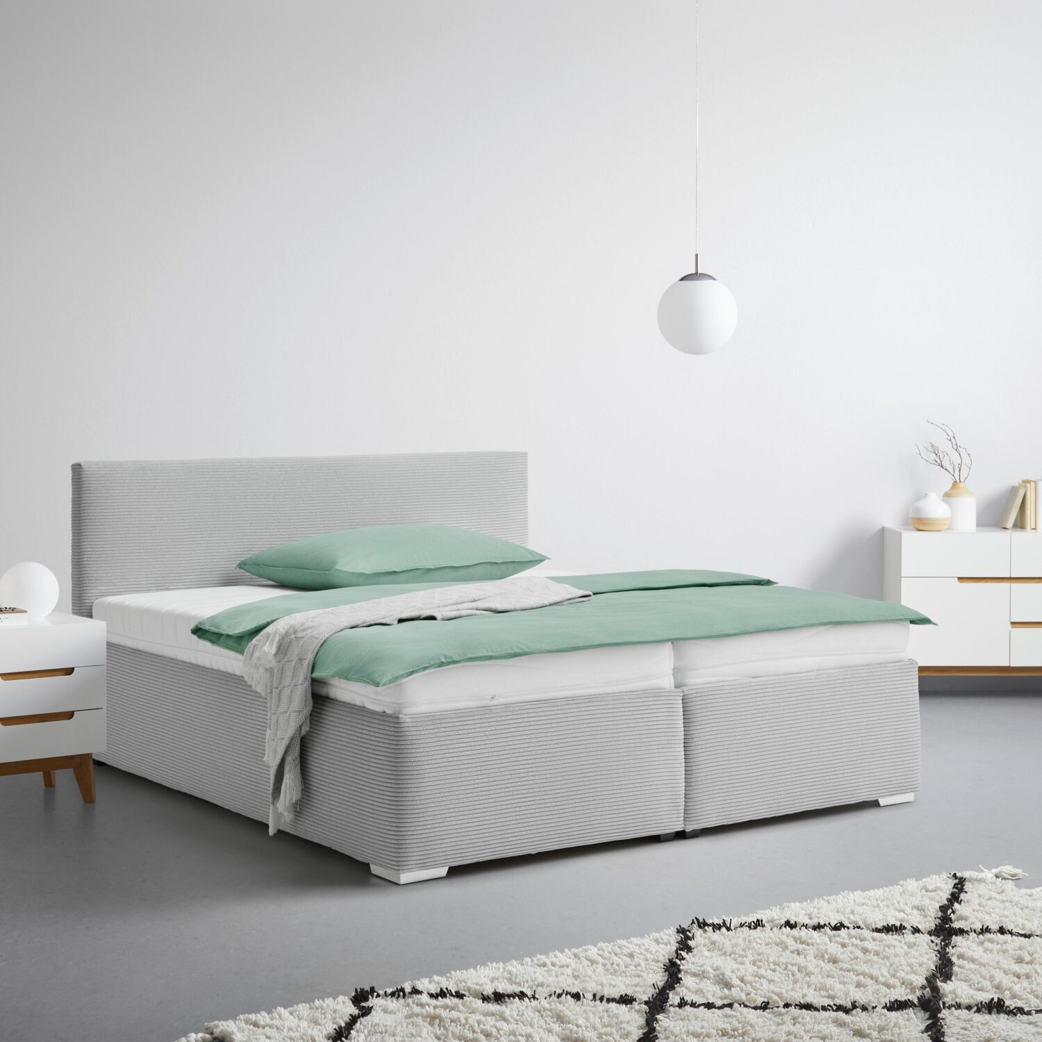 Unser großzügiges Boxspringbett in Grau bietet nicht nur ausreichend Platz für erholsame Nächte, sondern auch höchsten Schlafkomfort. Mit einer Liegefläche von ca. 200×200 cm und einer angenehmen Komforthöhe genießen Sie Luxus und Entspannung in Ihrem Schlafzimmer. Ein gepolstertes Kopfteil in Grau verleiht dem Bett eine elegante Note und bietet zusätzlichen Komfort beim Lesen oder Entspannen im Bett. Die eckigen Kunststofffüße in Chromfarben runden das moderne Design perfekt ab. Im Lieferumfang enthalten sind der Lattenrost und die Matratzen. Bitte beachten Sie, dass Kissen, Tagesdecke, Topper und motorische Verstellbarkeit nicht enthalten sind. Die Matratze verfügt über einen festen Härtegrad und einen Kern aus Polyurethanschaum für optimalen Liegekomfort. Gönnen Sie sich luxuriöse Nächte und erholsamen Schlaf mit unserem hochwertigen Boxspringbett.
