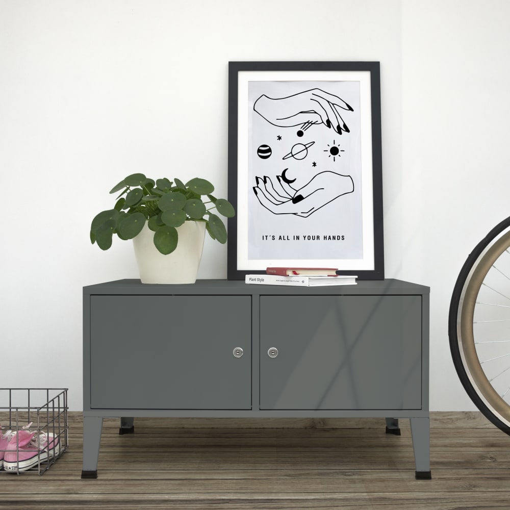 Das grau lackierte Blech macht das Element zu einem sehr vielseitigen Stück.