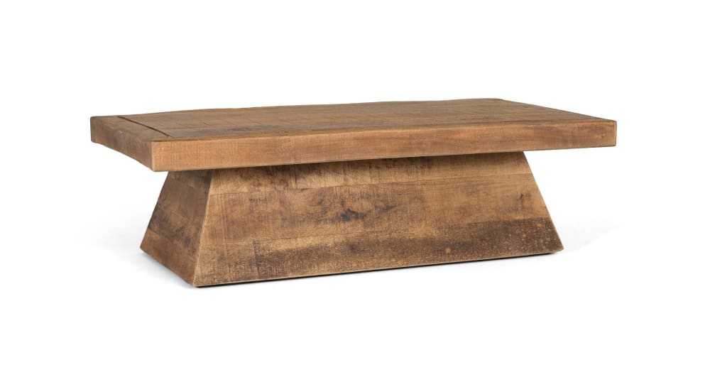Dieser Couchtisch ist aus massivem Mangoholz gefertigt. Er zeichnet sich durch eine geradlinige, rechteckige Form aus, mit einem soliden, sockelförmigen Mittelfuß, der ihm Stabilität und ein robustes Aussehen verleiht. Seine natürliche Oberfläche betont die für Mangoholz typischen Brauntöne und -variationen. Ein schlichter, aber dennoch markanter Tisch.