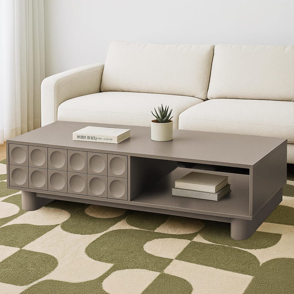 Entdecken Sie den Couchtisch OCTAVE, der modernes Design mit hoher Funktionalität harmonisch verbindet. Mit seinen Maßen L120 x B60 x H38,5 cm passt er perfekt in Ihr Wohnzimmer und bietet gleichzeitig praktischen Platz für Ihre Alltagsgegenstände. Dieses Möbelstück ist für eine maximale Belastung von 50 kg ausgelegt und eignet sich daher ideal zur Aufbewahrung Ihrer Bücher, Zeitschriften oder Dekorationsartikel. Die integrierte Schublade erleichtert die Aufbewahrung von Fernbedienungen und anderen kleinen Accessoires, während das Push-to-Open-System für eine klare Ästhetik ohne sichtbare Griffe sorgt. Hergestellt aus melaminbeschichtetem MDF, ist dieser Tisch langlebig und pflegeleicht. Hergestellt aus Eukalyptusholz, stellt es eine umweltfreundliche Option dar.Verwandeln Sie Ihr Interieur mit dem Couchtisch OCTAVE: ein Möbelstück, das Eleganz, Komfort und Funktionalität vereint und Ihren Alltag bereichert.Eigenschaften: Anzahl der Schubladen: 1 Schublade Maximale Belastung: 50 kg Maximale Belastung der Regale: 8 kg pro Ebene Öffnungssystem: Drucksystem Inneres der Schublade: L55 x B31 x H15 cm Offenes Fach: L60 x T20 x H20 cmMaße: Höhe: 38,5 cm; Breite: 60 cm; Länge: 120 cm; Gewicht: 25 kg.