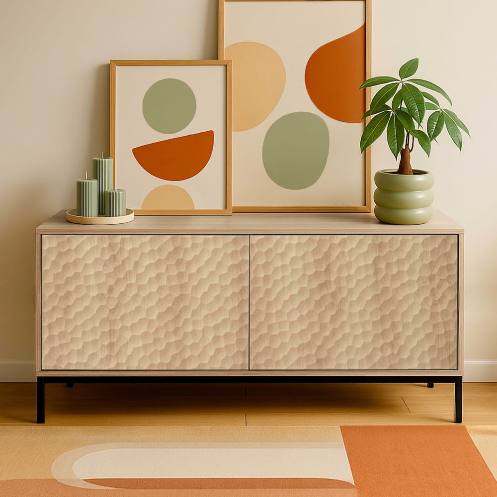 Dieser moderne KETRY TV-Schrank ist 120 cm lang, 40 cm tief und 54 cm hoch und verfügt über zwei Türen. Er trägt maximal 50 kg, wobei jedes Regal für bis zu 8 kg ausgelegt ist. Das Öffnungssystem basiert auf der Push-up-Technologie.Die Deckplatte besteht aus melaminbeschichtetem MDF, die Türpaneele aus geschrumpfter PVC-Folie mit dreidimensionalen Reliefmustern. Die Struktur besteht aus schwarz elektrolumineszierend lackierten Metallrohren mit Eukalyptuselementen, die Eleganz und Stabilität vereinen.Eigenschaften: 2 Türen maximale Tragkraft: 50 kg maximale Tragkraft der Regale: 8 kg pro Ebene Öffnungssystem: Push-upMaße: Höhe 54 cm, Breite 40 cm, Länge 120 cm, Gewicht 20 kg.