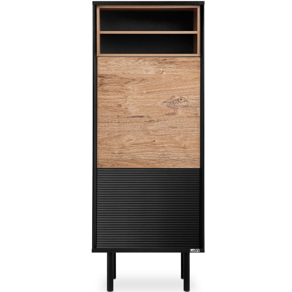 – Produkt entworfen und hergestellt in EU.- Die Möbel haben Vertiefungen und ungleichmäßige Oberflächen, so dass das Massivholz nicht eben ist.- Das Push-to-Open-System verfügt über spezielle Verriegelungen, so dass Sie nur an der richtigen Stelle auf die Tür oder die Schubladen drücken müssen, um sie zu öffnen.- Das Möbel steht auf hohen Beinen aus massivem, lackiertem Holz, die zusätzlich verstellbar sind.- Die Möbel sind aus einer laminierten Platte gefertigt, die keinen Staub anzieht und mit einem Tuch gereinigt werden kann.Die LOFTY-Kollektion ist das Werk angesehener Professoren, die sie so vielseitig und anpassungsfähig wie möglich gestaltet haben. Die Möbel sind mit verschiedenen Arten von Regaleinsätzen ausgestattet, die sich in Form und Farbe unterscheiden. Ebenso wichtig ist die Kombination aus schwarzem Laminat und eichenfarbenem Dekor, die perfekt zusammenpassen. Die Kollektion ist nicht nur für den rohen Industriestil, sondern auch für den wärmeren Loft-Stil geeignet. Der Loft RTV-Schrank in Eiche natur/schwarz ist in erster Linie ein Möbelstück für Nutzer, die Wert auf Details und hochwertige Verarbeitung legen. Er bietet Platz für viele praktische Dinge wie Dokumente, Fernsehgeräte oder andere wichtige Dinge. Die gesamte Kollektion besteht aus drei Arten von Kommoden, zwei Arten von Bücherregalen, Vitrinen und RTV-Schränken.A) Das Push-to-Open-Schließsystem verfügt über spezielle Verriegelungen, so dass Sie einfach an der entsprechenden Stelle auf die Tür oder die Schubladen drücken, um sie zu öffnen. B) Die Türen sind mit in drei Ebenen verstellbaren Scharnieren versehen. C) Das Möbelstück hat Vertiefungen und ungleichmäßige Oberflächen, so dass das Material nicht eben ist. SKU:12607.34.883