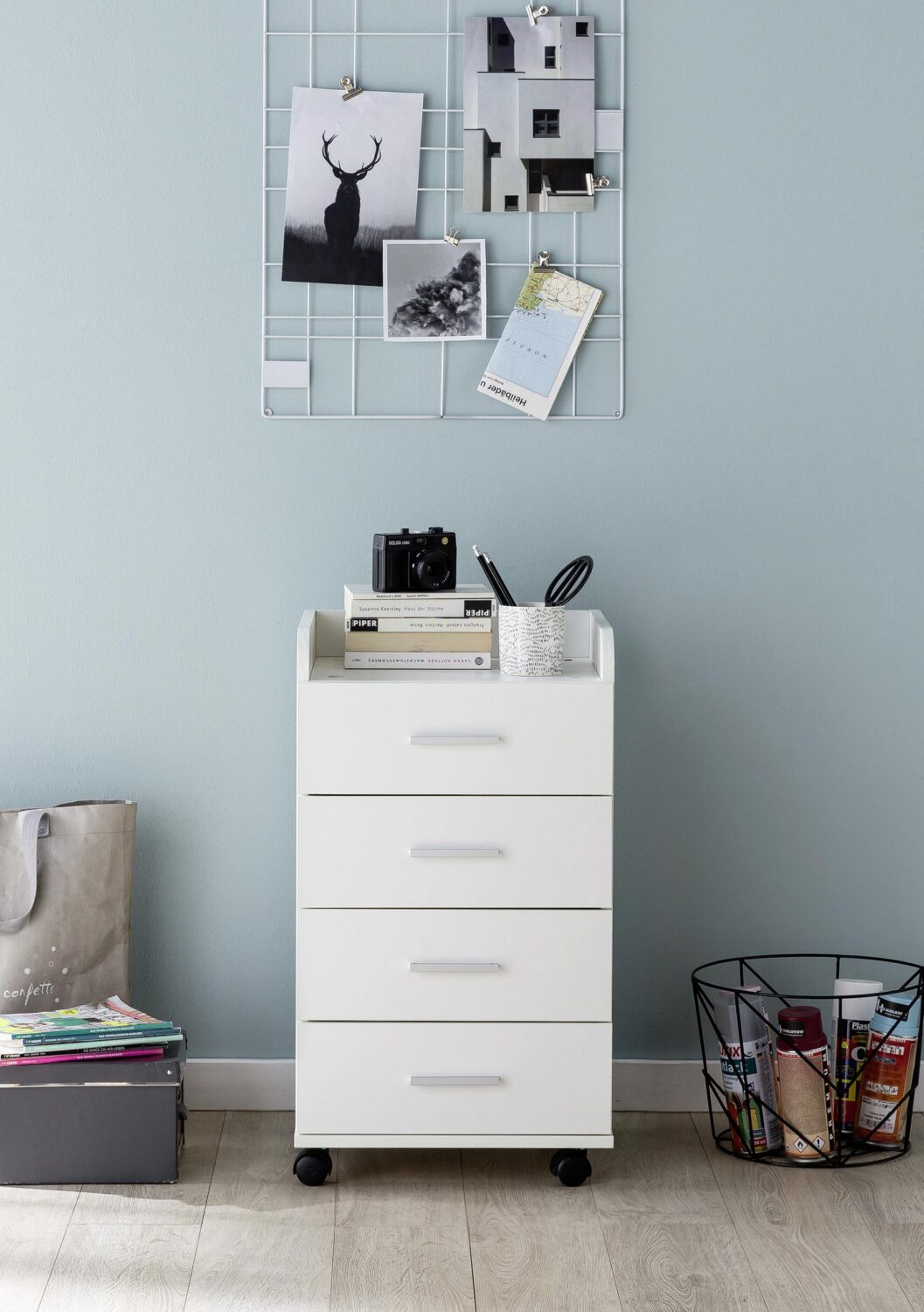 Dieser Rollcontainer in Weiß aus MDF punktet mit geradliniger Optik und praktischen Details. In den 4 Schubladen mit Komfortauszug lassen sich allerlei Unterlagen griffbereit unterbringen. Die Oberfläche ist dank Melaminharzbeschichtung kratzfest und pflegeleicht. Griffleisten aus Metall in Silberfarbe fügen sich harmonisch ins Gesamtbild ein. Die hochgezogene Umrandung schafft obenauf eine zusätzliche Ablagefläche. Hier finden Stifte und andere Schreibutensilien optimal Platz.