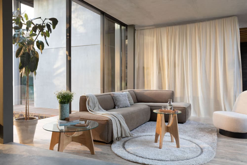 Der Beistelltisch Kobe vereint zeitloses Design mit eleganten Materialien. Hergestellt aus Eschenholz und einer stilvollen Glasplatte, besticht er durch seine minimalistische Ästhetik, die gleichzeitig Charakter und Raffinesse ausstrahlt. Ob alleinstehend oder in Kombination mit dem passenden Couchtisch, dieser Tisch schafft eine harmonische und einladende Atmosphäre in jedem Raum. Seine schlichte Form fügt sich nahtlos in moderne Wohnkonzepte ein und setzt natürliche Materialien gekonnt in Szene. Eigenschaften :Materialien : HolzDurchmesser : 45 cm Struktur : HolzHöhe : 55 cm