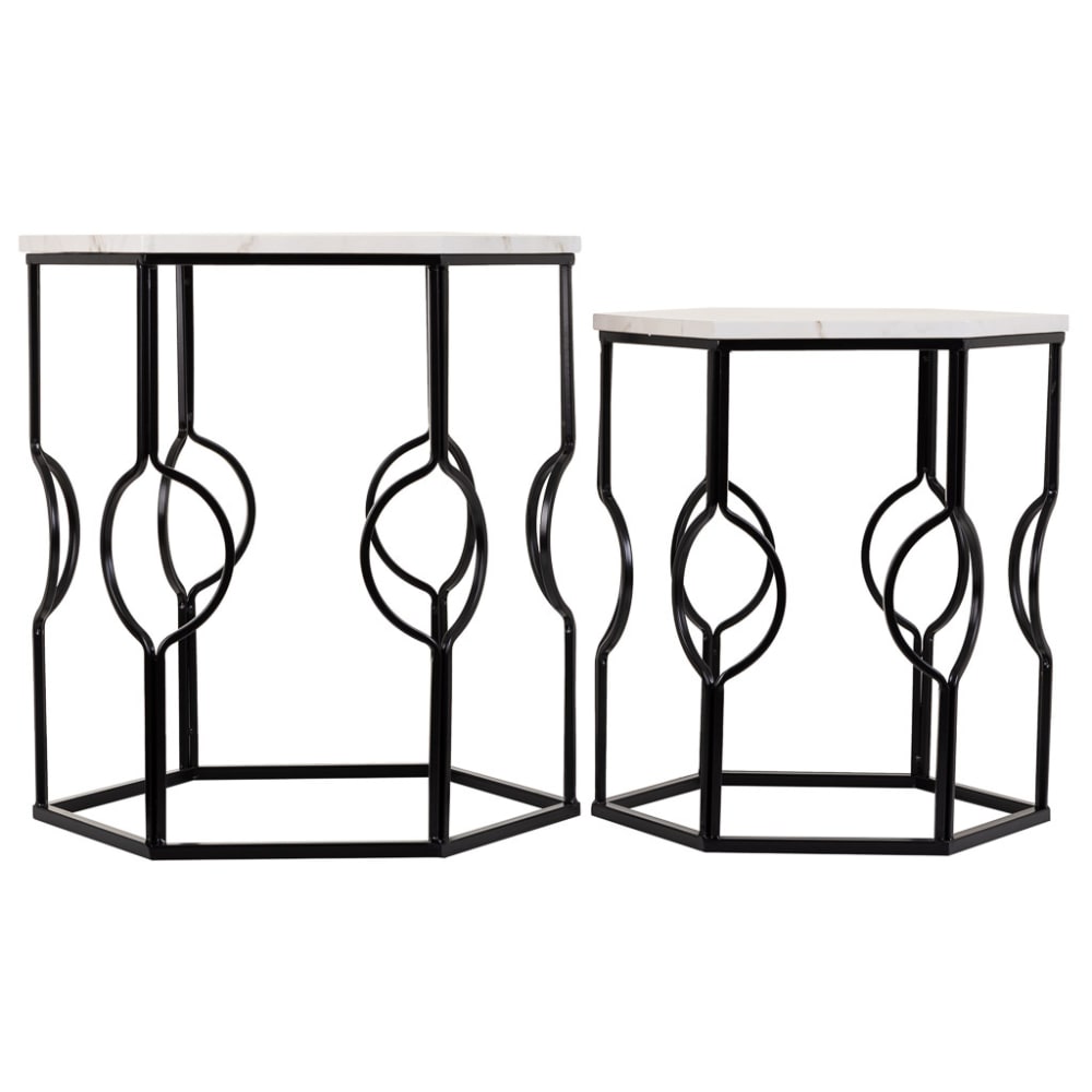 Die 2er-Beistelltische aus schwarzem Metall sind elegant und funktional. Sie haben ein modernes Design und sind perfekt für jeden Raum. Sie sind sehr robust und langlebig und können sowohl im Innen- als auch im Außenbereich verwendet werden.