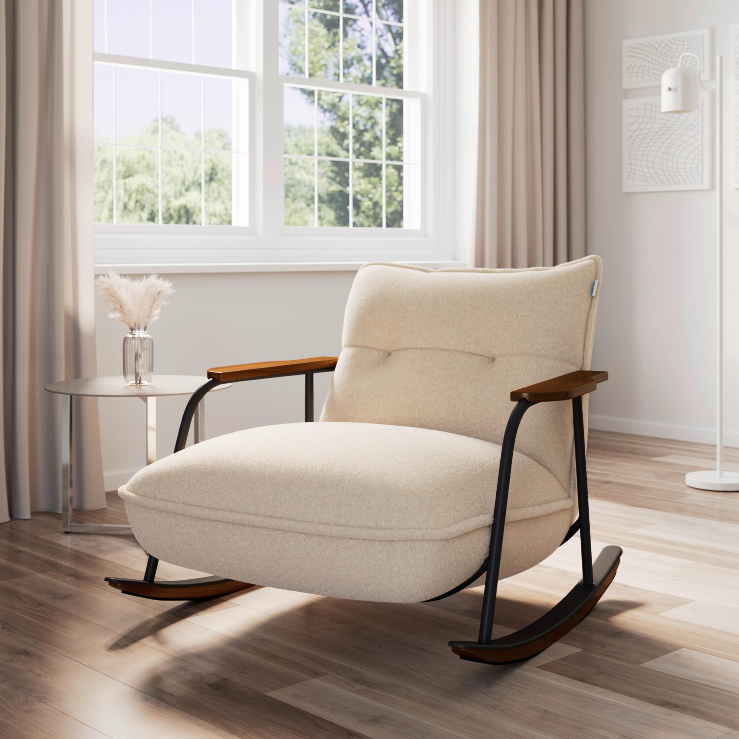 Der Schaukelstuhl INES von Bessagi Home verbindet traditionelles Design mit modernem Komfort. Gefertigt aus hochwertigem, vollmassivem Kautschuk- und Eukalyptusholz, besticht dieser Schaukelstuhl durch seine natürliche Farbgebung und die langlebige, lackierte Oberfläche. Mit einem großzügigen Sitz von ca. 74 cm Breite und einer Sitzhöhe von ca. 46 cm bietet der Sessel auch bei längerer Nutzung höchsten Komfort. Die Polsterung aus Schaumstoff und Polyester mit Taschenfederkern sorgt für eine angenehme Unterstützung, während die Wippfunktion zum entspannten Zurücklehnen einlädt. Produktdetails: Maße (B x H x T): ca. 89 x 77 x 94 cm Material: Massivholz (Kautschukholz, Eukalyptus), Polyester, Eisen (pulverbeschichtet) Bezug: Beiger Bouclé-Stoff, pflegeleicht – einfach trocken wischen Fußform: Stabiler C-Fuß in naturfarbenem Holz Armlehnenbreite: ca. 8 cm, Armlehnoberkante ca. 53 cm Maximale Belastbarkeit: ca. 120 kg Polsterung: Schaumstoff mit Taschenfederkern für optimalen Sitzkomfort Der Schaukelstuhl INES ist die perfekte