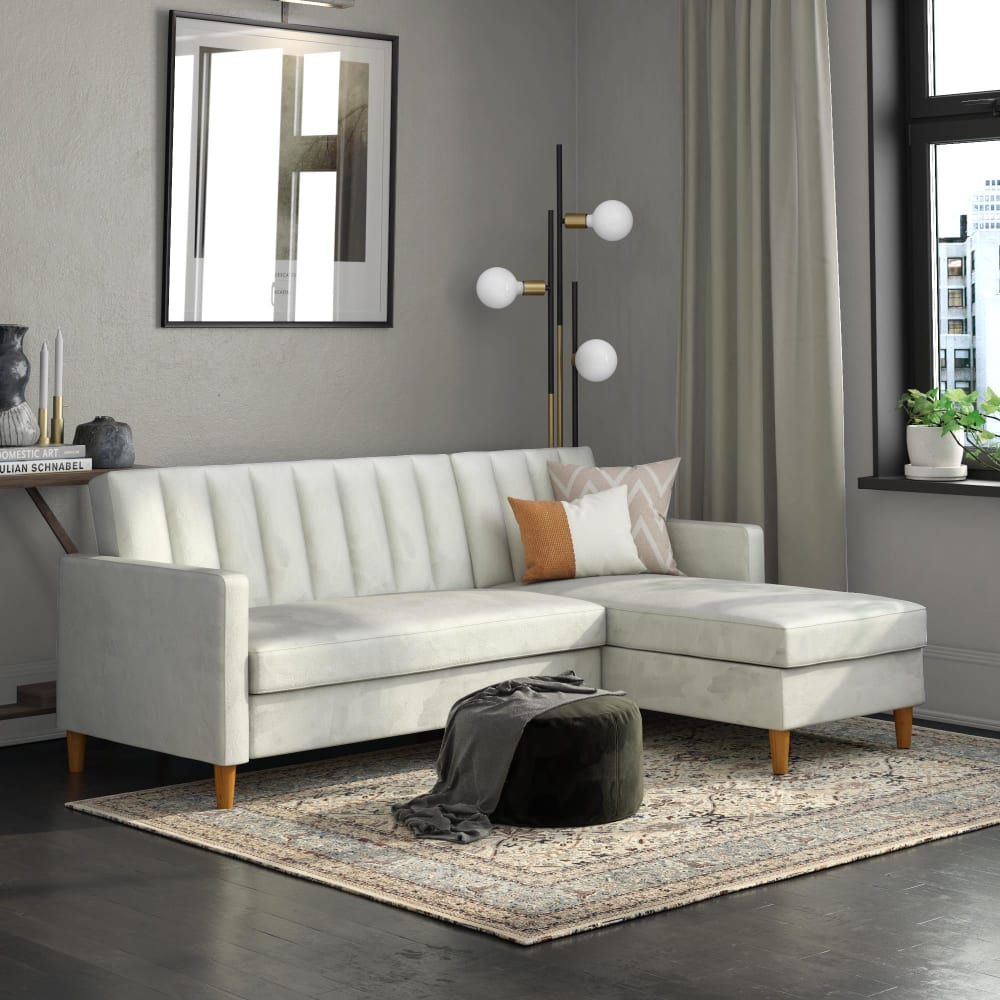 Modernes Schlafsofa mit Samtpolsterung und vertikalen Nähten in der Rückenlehne.