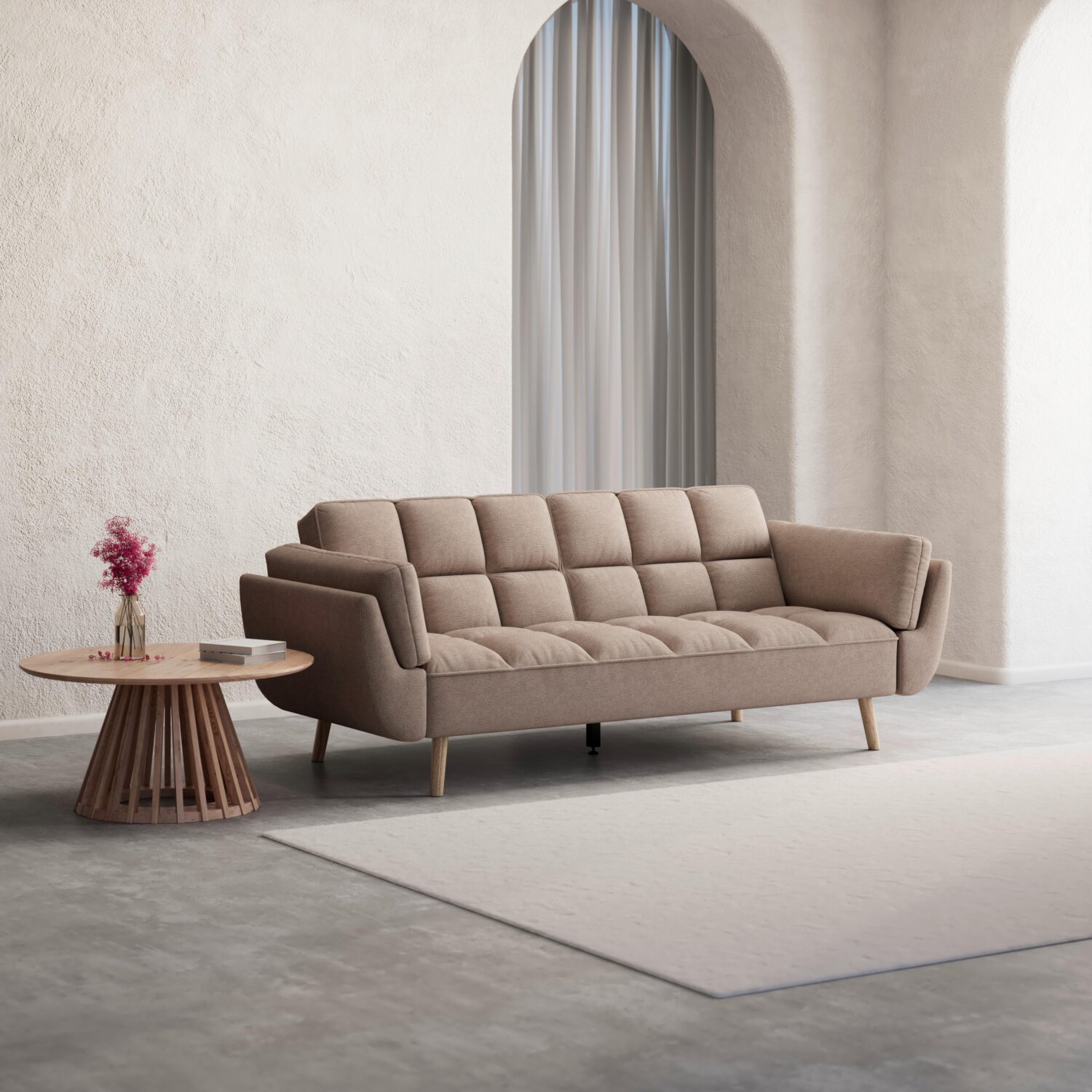 Das Schlafsofa Cora vereint modernes Design mit hohem Komfort – ideal für kleine Wohnungen, Gästezimmer oder als gemütliche Sitz- und Schlafgelegenheit im Wohnzimmer. Der edle braune Webstoff aus robustem Polyester und Polyamid verleiht dem Sofa eine warme, einladende Ausstrahlung. Vielseitig & platzsparend: Perfekt für entspannte Stunden und Gäste Mit der praktischen Liegefunktion (Kippbett) lässt sich das Sofa schnell in ein komfortables Bett verwandeln. Die angenehme Liegehöhe von ca. 44 cm sorgt für bequemen Einstieg und erholsamen Schlaf. Trotz kompakter Maße von 212 × 106 cm bietet das 3-Sitzer Sofa ausreichend Platz zum Relaxen – ideal für Wohnräume mit begrenztem Platz. Hochwertige Materialien & robuste Verarbeitung Das Innenleben besteht aus einer Kombination von Gurtfederung, Schaumstoff und Wellenunterfederung, die für langlebigen Sitzkomfort sorgt. Die stabilen, massiven Echtholzfüße aus Kautschukholz in Naturfarben setzen einen natürlichen Akzent und garantieren sicheren Stand. Mit einer Belastbarkeit von bis zu 360 kg ist das Schlafsofa auch für den täglichen Gebrauch bestens geeignet.