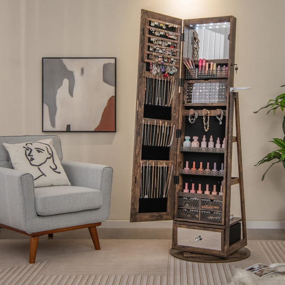 Um 360° drehbarer Schmuckschrank: Dieser Schmuckschrank verfügt über einen um 360° drehbaren Sockel und bietet einfachen Zugriff auf Ihren Lieblingsschmuck aus allen Richtungen.