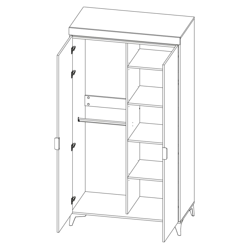 Schrank 2 Türen inkl. LED Ruben HolzKollektion :: Ruben Materialien : Vorderseite aus MDF-PlattenKorpus aus LaminatplattenGriffe aus MetallFüße aus ABS Farben: Holz in EichenoptikBeine und Griffe mattschwarz Eigenschaften : 2 Türen4 Regale, davon 3 verstellbar2 Kleiderschränke Türen mit geräuschlosem SchließsystemSchubladenschienen mit VollauszugKaltweißer LED-Lichtstreifen InklusiveLED zum Einstecken in die Steckdose mit einem Ein-/Ausschaltknopf Produktgewicht und Abmessungen : 83 kg105 x 55 x 195 cm Verpackung : Produkt wird zur Montage geliefert, inkl. Anleitung Garantie: 24 Monate Gesamtanzahl der Kartons : 4
