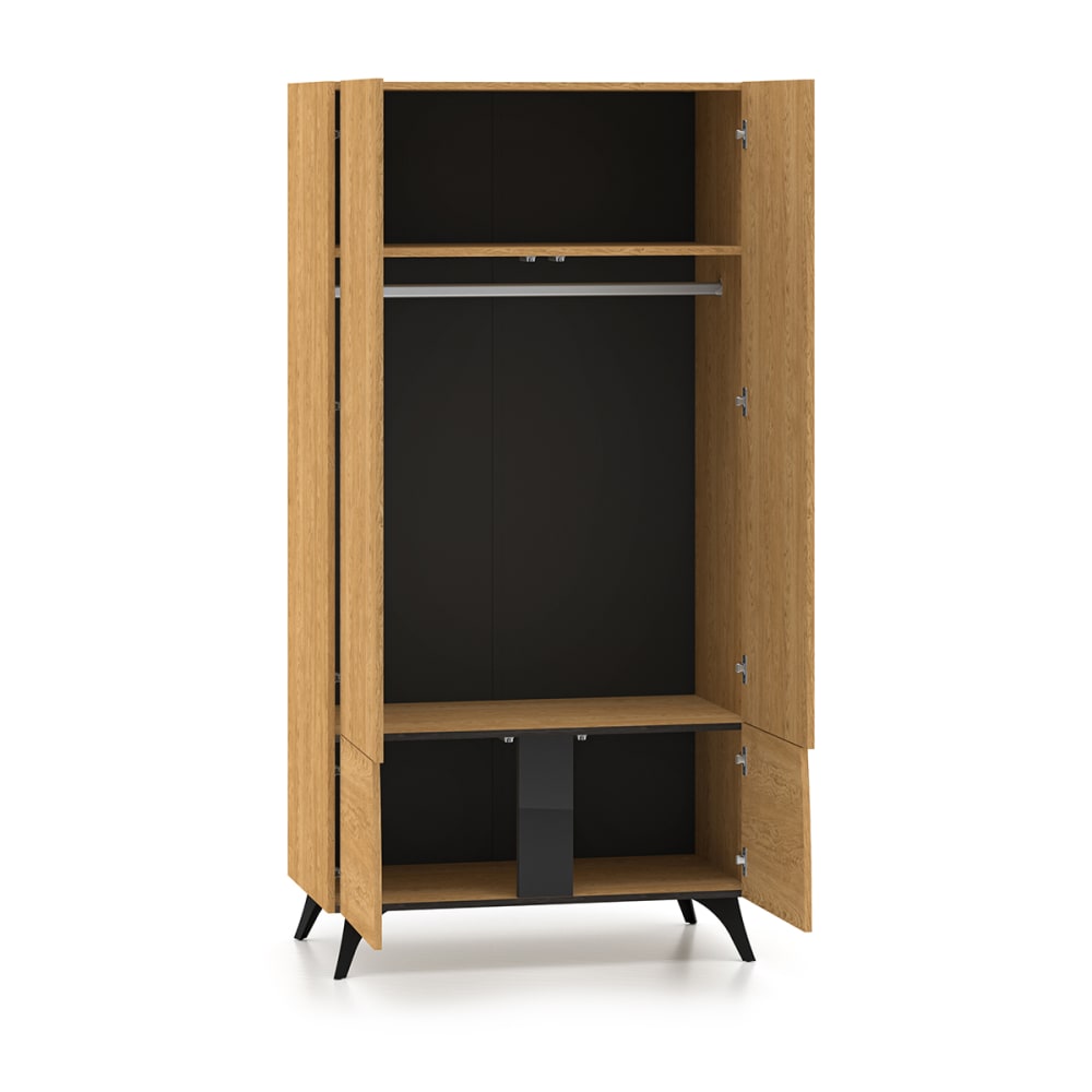 4-türiger Schrank Soah Holz und SchwarzKollektion :: Soah Material: MDF-PlattenSchwarz lackierter GlaseinsatzGute Beständigkeit gegen Kratzer, Feuchtigkeit und hohe Temperaturen Farben: Holz und Schwarz Eigenschaften: 4 TürenPush-to-open-System2 große Regale1 Kleiderschrank2 Fächer untenEmpfohlene maximale Belastung: 10 kg auf den RegalenHöhe der Füße: 14 cm Gewicht und Abmessungen : Schrank: 67 kg95 x 52 x 190 cm Verpackung : Produkt wird zur Montage geliefert, inklusive Anleitung. Garantie: 24 Monate Gesamtanzahl der Kartons : 2 Gewicht und Abmessungen der Kartons: 27 kg118 x 57 x 9,5 cm / 40 kg189 x 57 x 8 cm Gesetzlicher Vertreter: NAPKINS, 30-34 avenue Henri Matisse, 06200 Nizza, FRANKREICH