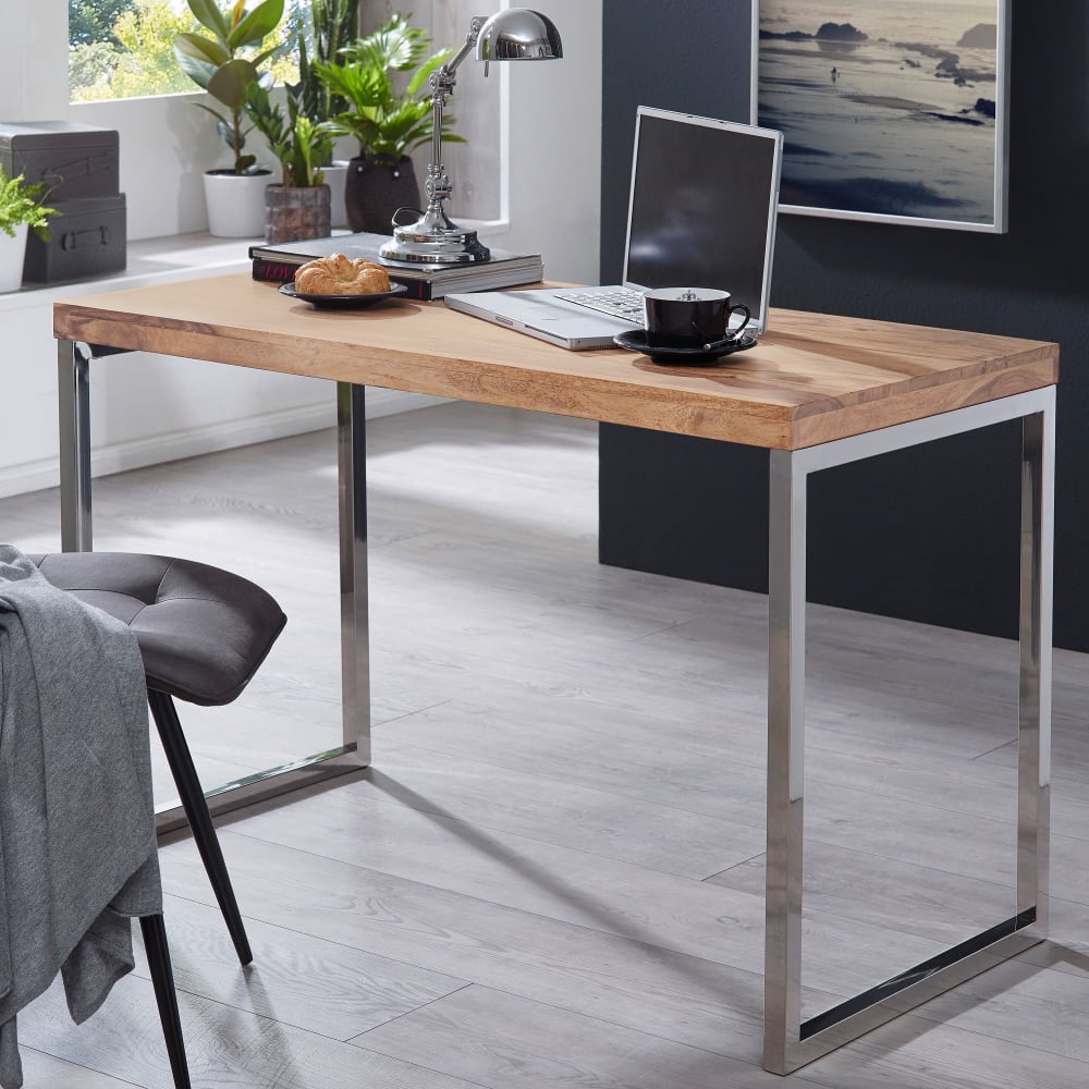 Design & Verwendung: Durch die einfache und platzsparende Form lässt sich der Schreibtisch überall ohne Probleme platzieren. Der Abstand vom Boden bis zur Unterkante des Tisches beträgt 71 cm – Sie können somit mit Ihrem Bürostuhl ganz einfach unter den Tisch fahren um eine optimale Sitzposition bei der Arbeit am Tisch zu haben.  Pflegehinweise: Die Oberfläche mit einem lauwarm angefeuchteten Baumwolltuch reinigen. Keine Scheuermittel, scharfen Reinigungsmittel oder tropfnassen Tücher verwenden. Keine weitere Behandlung der naturbelassenen Oberfläche (Ölen, Wachsen) notwendig. DesignSchreibtisch in geradlinigem warmen DesignEinzigartige Maserung und HolzstrukturVerchromtes Metallgestell an beiden Seiten – Kontrast zum warmen HolztonAbmessungenHöhe: 76 cmBreite: 120 cmTiefe: 60 cmBoden bis Tischunterkante: 71 cmBesonderheitenGefertigt in HandarbeitJeder Artikel ein UnikatKomplett nutzbare Oberfläche – Flexible Gestaltung und Organisation des ArbeitsbereichsAufgrund der einfachen Form und der praktischen Größe vielseitig einsetzbarOhne Probleme mit Arbeitshocker oder Bürostuhl verwendbarMaterialTischplatte: MassivholzGestell: MetallHandgefertigtes Naturprodukt mit Liebe zum Detail – Farbabweichungen und Unebenheiten machen das Produkt zu einem EinzelstückLieferumfang 1 SchreibtischLieferung ohne DekorationMontageLieferzustand: Teilmontiert