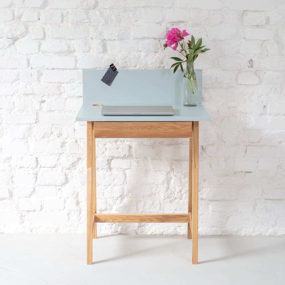 Der platzsparende Schreibtisch LUKA hat alles, was Sie benötigen, um ein modisches und gut organisiertes persönliches Heimbüro oder Arbeitszimmer zu gestalten. Es verfügt über eine handgefertigte Holzschublade mit abnehmbarem Sicherheitsstopper und Kabelführungsschlitz. Die Basis mit Fußstütze hilft, Ermüdung zu reduzieren, die richtige Position zu fördern, und die abnehmbare Rückwand bietet eine zusätzliche Fläche für Haftnotizen oder Lieblingsfotos. Die 65 cm breite LUKA-Option wurde speziell für kleine Wohnungen entwickelt, um viele funktionale Merkmale zu bieten und gleichzeitig sehr wenig Platz einzunehmen.