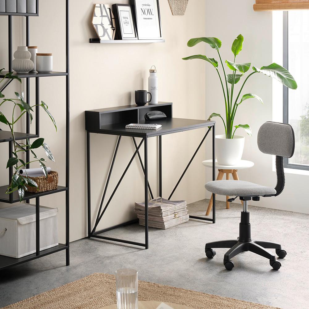 Minimalismus kann sooo gut aussehen! Dieser Schreibtisch in Schwarz ist das beste Beispiel. Mit diesem ca. 91 x 87 x 50 cm (B x H x T) großen Tisch holen Sie sich ein trendiges Möbelstück in Ihr Zuhause. Ob im Arbeits- oder Schlafzimmer, dieser Schreibtisch macht überall eine gute Figur. Der Tisch aus Holzdekor ist mit 4 Flachrohrbeinen in Schwarz geschmückt. Feine Metallstreben an den Seiten vollenden das Design. Der Schreibtisch besitzt ein offenes Fach und kann mit wichtigen Ordnern oder Gegenständen gefüllt werden. Auch für Dekoartikel jeder Art ist ausreichend Platz vorhanden.
