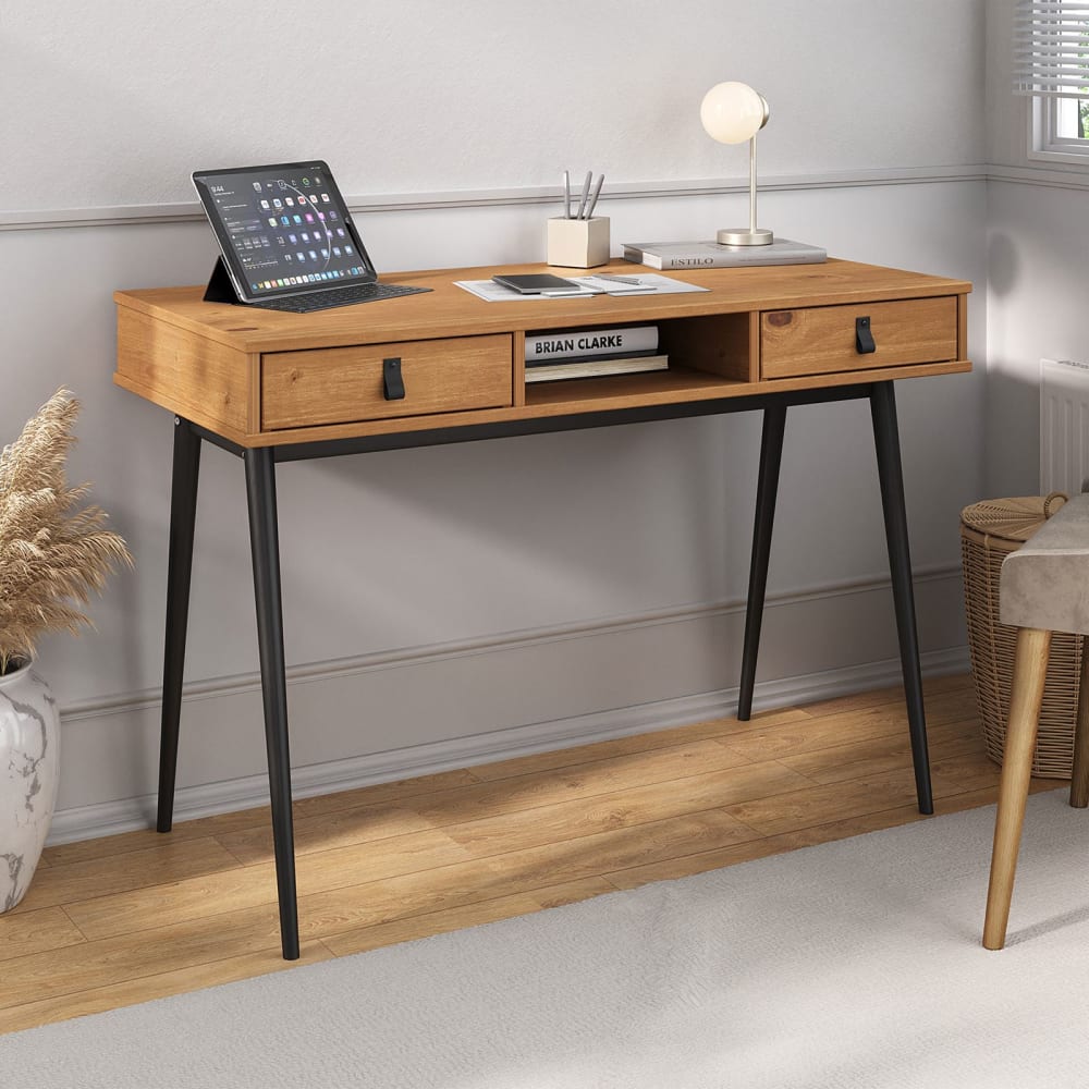 Dieser elegante bürotisch, gefertigt aus massivem Kiefernholz, verleiht jedem Raum einen Hauch von Stil. Die eichefarbene lackierte Tischplatte ist großzügig gestaltet und bietet ausreichend Platz für Ihre Bürobedürfnisse. Mit zwei praktischen Schubladen und einem offenen Fach ausgestattet, bietet der PC-Tisch viel Stauraum. Die schwarzen ausgestellten Beine sorgen für Stabilität, während die Lederlaschen an den Schubladen als optische Highlights dienen.