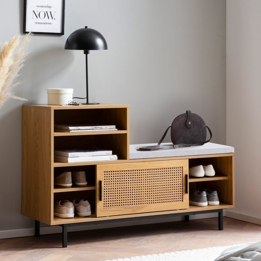 Entdecke die Vielseitigkeit Die passende Lösung um deine Schuhe ordentlich zu verstauen und gleichzeitig einen gemütlichen Sitzplatz zu schaffen ist diese Schuhbank! Das moderne Design fügt sich nahtlos in jeden Einrichtungsstil ein und macht die Garderobenbank zu einem echten Hingucker in deinem Eingangsbereich. Mit den praktischen Fächern und der großzügigen Sitzfläche bietet dieses Möbelstück nicht nur optimalen Stauraum für deine Schuhe, sondern auch einen komfortablen Platz, um sich beim An- und Ausziehen hinzusetzen. Das robuste Material garantiert eine lange Lebensdauer und die leichte Pflege sorgt dafür, dass du lange Freude an deiner neuen Schuhbank haben wirst. Sorge für Ordnung und Komfort in deinem Zuhause Diese Flurbank mit Sitzfläche ist der perfekte Begleiter für einen organisierten und einladenden Eingangsbereich. Die warme Holzoptik und die feinen Details, wie das Wiener Geflecht an der Front, verleihen deinem Raum eine natürliche und freundliche Atmosphäre. Ob du nach einem langen Tag nach Hause kommst oder dich auf den Weg nach draußen machst die Schuhbank unterstützt dich dabei, alles an seinem Platz zu finden. Die Kombination aus Funktionalität und Design macht dieses Möbelstück zu einer lohnenden Investition für jeden, der Wert auf Ordnung, Ästhetik und Komfort legt. Lass dich von der Qualität und dem Design unserer Schuhbank überzeugen und erlebe, wie sie deinen Alltag bereichert.
