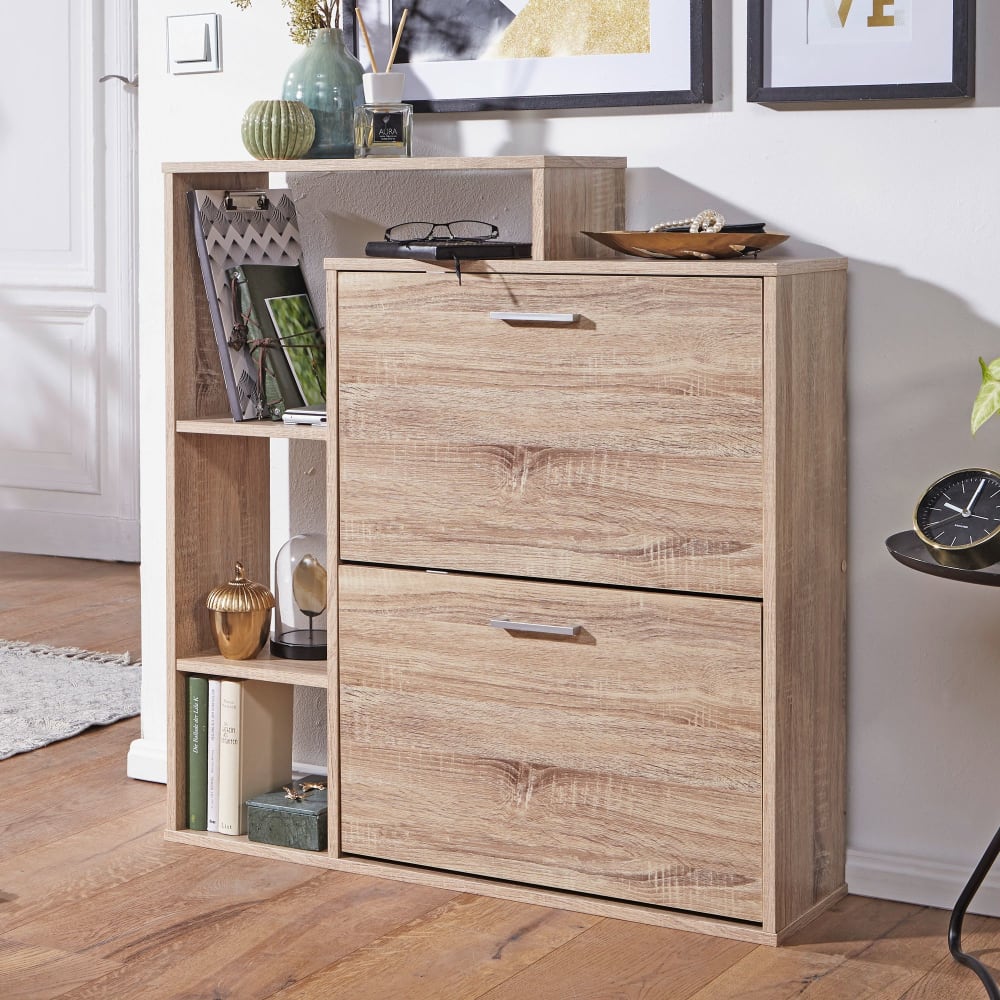 Hinweise zum Produkt: Die Anzahl der hineinpassenden Schuhe wurde mit Schuhgröße 38 getestet. Die maximale Schuhgröße beträgt ca. 41, kann aber je nach Schuhmodell abweichen. DesignModernes Design mit edlen Metallgriffen 2 Schuhfächer zum Aufklappen und mehrere AblagefächerAbmessungenHöhe: 93 cmBreite: 85 cmTiefe: 24 cmMaße 2 Fächer innen  BxHxT: 56 x 22,5 x 33 cmUnterstes Regal BxHxT: 23,5 x 22 x 24 cmMittleres Regal BxHxT: 23,5 x 31 x 24 cmOberstes Regal BxHxT: 23,5(52,5) x 34(11,5) x 24 cmFarbeSchrank: Sonoma EicheBesonderheitenElegante Griffe an jedem der beiden Klappfächer2 Schuhfächer mit Kippfunktion bieten jeweils Platz für 6 Paar SchuheGesamt Platz für 12 Paar SchuheRegal mit 3 unterschiedlich großen Fächern – Platz für Deko-Artikel aller ArtAblagefläche auf dem SchrankMaterialMDF HolzLieferumfang 1 SchuhschrankMontageLieferzustand: zerlegt und praktisch verpacktLeicht verständliche Montageanleitung und Montagematerial inklusiveEinfacher und schneller Aufbau dank gut durchdachter KonstruktionPflegehinweise: Die Oberfläche mit einem lauwarm angefeuchteten Baumwolltuch reinigen Keine Scheuermittel, scharfe Reinigungsmittel oder tropfnasse Tücher verwenden
