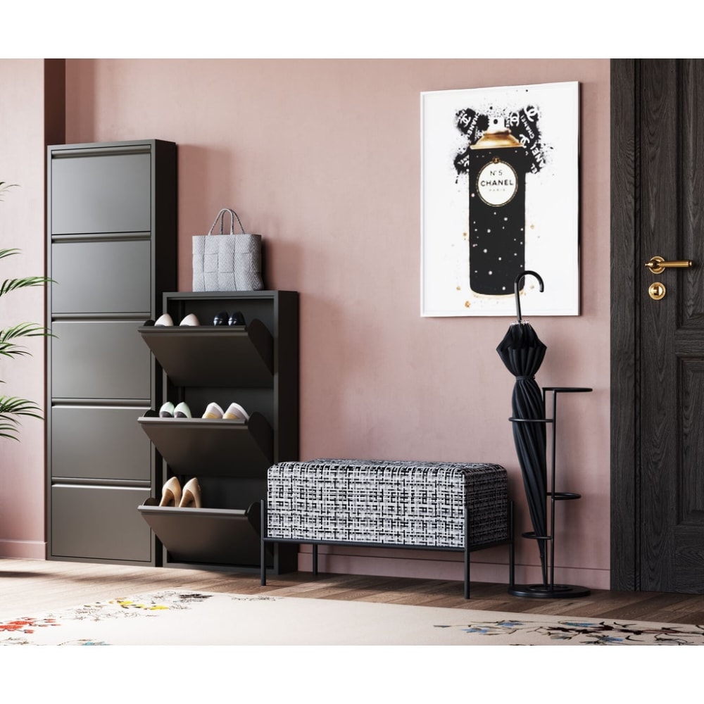 Dieser schwarze Schuhschrank verfügt über drei praktische Kippfächer und bietet großzügigen Stauraum für mindestens zehn Paar Schuhe, abhängig von ihrer Größe und Art. Gleichzeitig schützt er Ihre Schuhe zuverlässig vor Staub. Mit seinen glatten Fronten und geringen Maßen kann dieser Schuhkipper nahezu unsichtbar in Ihrem Zuhause platziert werden. Er lässt sich sogar bequem hinter einer Tür verstecken, wodurch er optimalen Platznutzen gewährleistet. Nicht nur Schuhverrückte lieben ihn: Auch Sportfans bringen hier alle Sneakers unter.