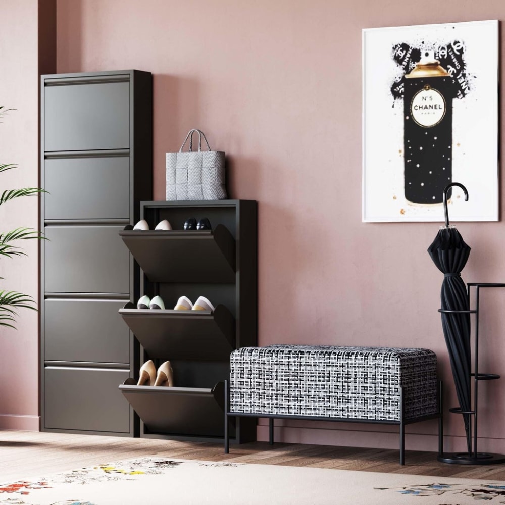 Unser praktischer Schuhschrank in schwarz verfügt über fünf Kippfächer. Er bietet großzügig Platz für mindestens zehn Paar Schuhe, abhängig von ihrer Größe und Art, und schützt sie effektiv vor Staub. Mit seinen glatten Fronten und geringer Tiefe kann dieser Schuhkipper nahezu unsichtbar in Ihrem Zuhause platziert werden, sogar hinter einer Tür. Er eignet sich ideal, um Ordnung zu schaffen und Ihre Schuhe diskret zu verstauen. Dieser Schuhschrank wird nicht nur Schuhliebhaber begeistern, sondern auch Sportfans die perfekte Aufbewahrung für ihre Sneakers bieten.