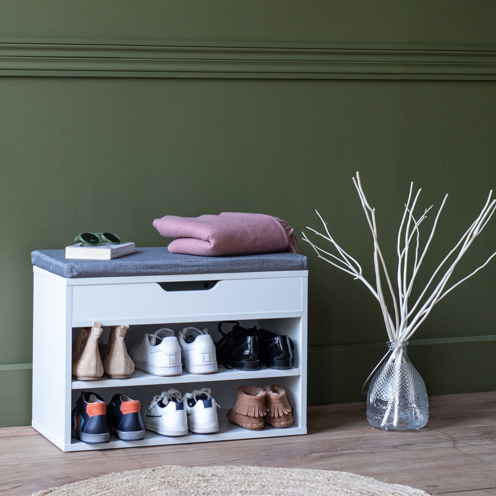 Gönnen Sie sich ein Schuhaufbewahrungsmöbel mit einem minimalistischen Design, das sich leicht in Ihre Einrichtung einfügt. Das Modell ALAN vereint diese beiden Funktionen Design und Zweckmäßigkeit in einem einzigen Möbelstück. Es verfügt über offene Fächer mit ausreichend Platz für die Schuhpaare, die Sie am häufigsten anziehen. Im oberen Fach können Sie Ihre Accessoires wie Schnürsenkel oder einen Schuhlöffel verstecken. So haben Sie einen gut organisierten Raum, ohne dass etwas auf dem Boden Ihres Hauses herumliegt. Ein Schaumstoffkissen über der Truhe bietet Ihnen eine bequeme Sitzgelegenheit beim An, und Ausziehen Ihrer Schuhe. Details: Abmessungen: Schuhschrank: L 60 × B 29,5 × H 42cm, Masse der Truhe: L 56 × B 26 × H 8cm, Maße Fächer: L 56 × B 27 × H 12,5cm, Maße Regal: L 56 × B 27 × Hp 1,5cm . Materialien : Gestell: Spanplatte, MDF, Kissen: Schaumstoff . Farben : Kissen: grau, Gestell: weiß . Zusätzliche Informationen : Maximal unterstütztes Gewicht: 70kg., Zum Zusammenbauen (inkl. Anleitung).