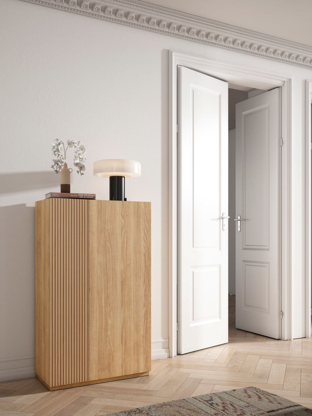 Verwandle dein Zuhause mit diesem eleganten Schuhschrank aus Melamin im zeitgenössischen Design, der Funktionalität und Stil vereint. Die makellose Oberfläche und klaren Linien machen ihn zu einem vielseitigen Möbelstück, ideal für jeden Raum. Die obere Ablage bietet die Möglichkeit, ihn mit dekorativen Elementen wie Büchern, Lampen oder Blumen zu personalisieren und verleiht so eine elegante Note zur praktischen Nutzung. Dieses Möbelstück ist nicht nur nützlich zur Aufbewahrung von Schuhen, Kleidung oder Büchern, sondern fügt sich auch perfekt als dekoratives Element im Eingangsbereich oder Schlafzimmer ein und hebt die Ästhetik deines Zuhauses mit einem praktischen, modernen Design hervor.Eigenschaften :Materialien : komplett aus Melamin gefertigt.2 asymmetrische Türen mit Soft-Close-Scharnieren, um Türknallen zu vermeiden.Die Ausführungen mit der schmalen Tür in Zaun-Optik haben keine Struktur, sondern einen glatten Druck auf Melamin, der die Reinigung erleichtert.5 horizontale Einlegeböden mit 3 Höhenoptionen zur individuellen Anpassung der Fächerhöhe (auch herausnehmbar, falls weniger Böden gewünscht sind).Kapazität : 18-20 Paar Schuhe.Zertifikate : FSC, PEFC.Herstellung : Spanien.Rückwand zum Schutz der Wand vor Flecken.Möbel als Bausatz mit Montageanleitung.Versand in 2 Paketen.Pflegehinweis :Reinigung mit trockenem oder leicht feuchtem Tuch unter Verwendung ausschließlich geeigneter Produkte für Holz und Möbel (das Möbelstück zu nass machen oder mit einem tropfnassen Tuch reinigen kann es beschädigen und ist nicht durch die Garantie gedeckt).Gesamtmaße :Höhe : 122 cm.Breite : 70 cm.Tiefe : 35 cm.Gewicht : 42 kg.Spezifische Maße :Nutzbare Maße der oberen Ablage: Länge 67 cm, Tiefe 33,5 cm.Höhe Sockel/unterer Rand: 2 cm.Innentiefe: 30 cm.Innenlänge: 67 cm.