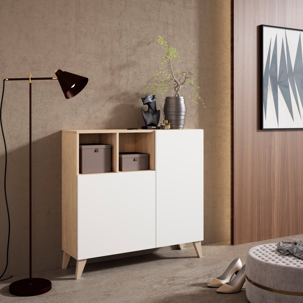 Lass dich von diesem stilvollen Schuhschrank aus Melamin mit charmanten Beinen aus Buchenholz verführen die perfekte Ergänzung als Schuhregal, Eingangs-Konsole oder eleganter Stauraum. Sein klares, vom skandinavischen Stil inspiriertes Design verleiht deinem Zuhause eine warme und moderne Note. Kompakt und multifunktional, optimiert er den Raum und hält dein Zuhause ordentlich. Die sorgfältige Verarbeitung und hochwertigen Materialien bieten eine praktische und ästhetische Lösung für den Alltag. Ein dekoratives Must-have, das Design und Funktionalität für ein durchdachtes Zuhause vereint!Eigenschaften :Materialien: Struktur und Türen aus Melamin, Beine aus massivem, lackiertem Buchenholz.Zertifizierung: FSC, PEFC.Hergestellt in: Spanien.5 Einlegeböden: 2 links und 3 rechts (wahlweise schräg oder waagerecht einsetzbar).Kapazität: 1012 Paar (Tiefe der waagerechten Böden 24 cm, der schrägen 30 cm).Rückwand zum Schutz der Wand und zum vollständigen Verschließen des Möbels.Die Scharniere aus vernickeltem Stahl sind mit Soft-Close-Funktion ausgestattet, um Türstöße zu vermeiden.Ähnliche Kollektion: Bergen 512.Zur Selbstmontage, Lieferung im Karton mit Montageanleitung.Pflegehinweis :Mit einem trockenen oder leicht feuchten Tuch und geeigneten Holzreinigern säubern (ein zu nasses Tuch kann das Möbelstück beschädigen).Gesamtmaße :Höhe: 87 cm.Länge: 90 cm.Tiefe: 27 cm.Gewicht: 27 kg.Spezifische Maße :Höhe und Länge der 2 oberen Fächer: 27 cm.Höhe der 3 unteren Fächer links: 14,5 cm.Höhe der 4 rechten Fächer von oben nach unten: 18 cm, 17 cm, 16 cm und 17 cm.Beinhöhe: 12 cm.Tiefe des schrägen Regals: 30 cm.Länge der linken Seite: 50 cm.Länge der rechten Seite: 35,5 cm.Nutzbare Tiefe: 25,5 cm.